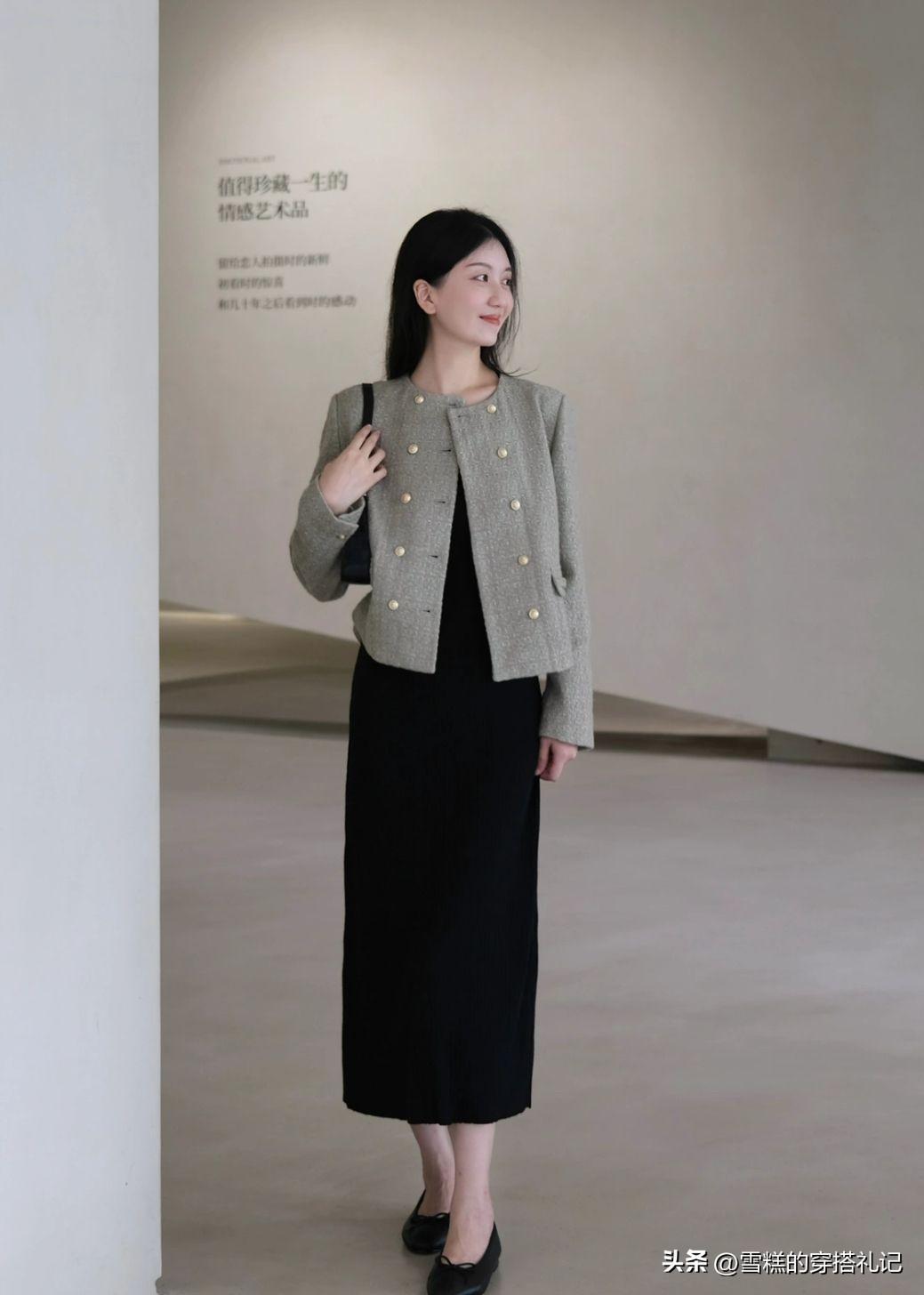 在小黑裙外面,我們則可以搭配一件有對比感的外套,比如灰色的雙排扣短外套,就能夠直接分割黃金比例,就算是配平底鞋,也不會有嫌矮的風險。
