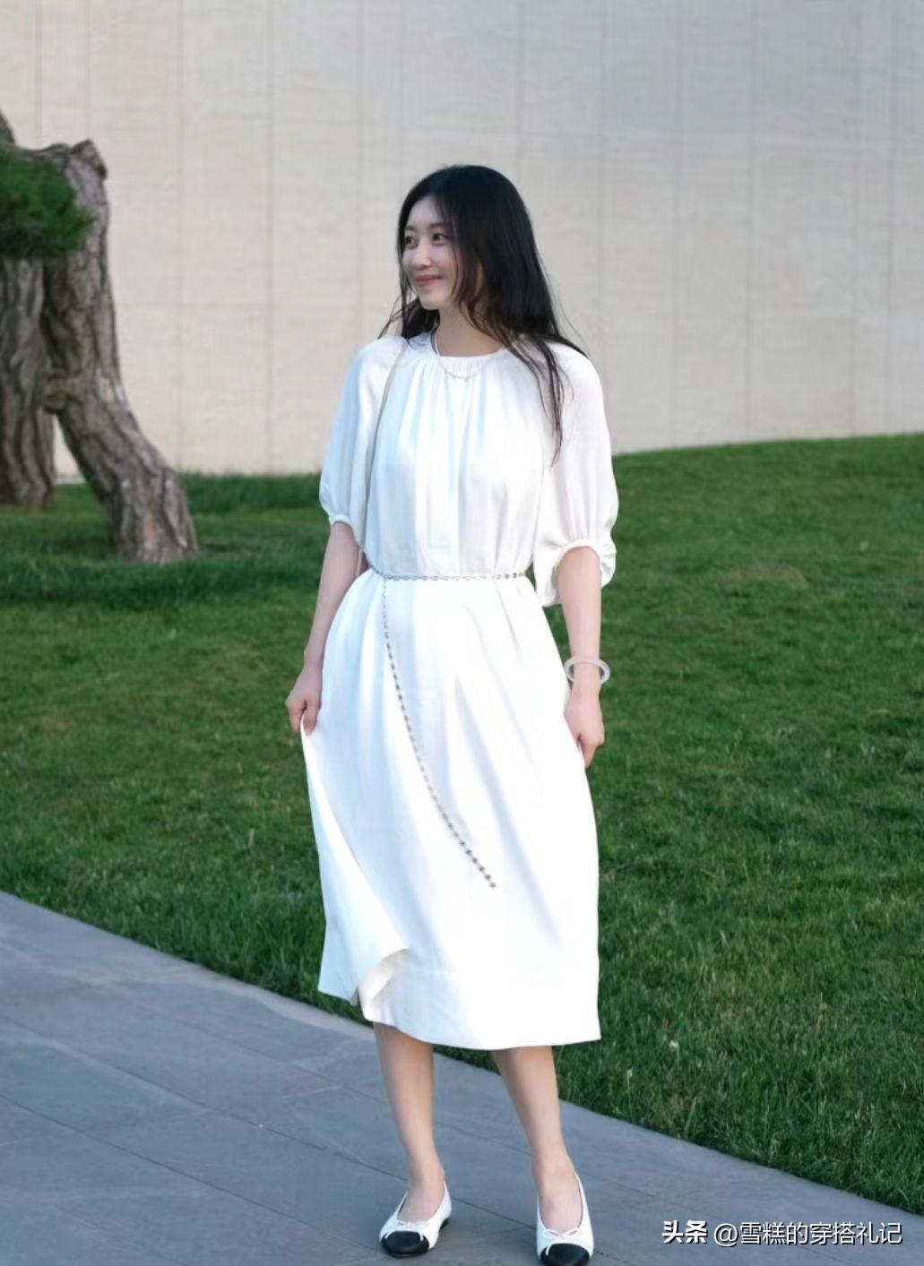 穿裙子,最難的就是比例分割的問題,最簡單的解決方式就是選擇收腰裙。無腰線的五分袖小白裙,通過腰帶進行勾勒,再踩上一雙淺口芭蕾鞋,就非常清爽顯高。