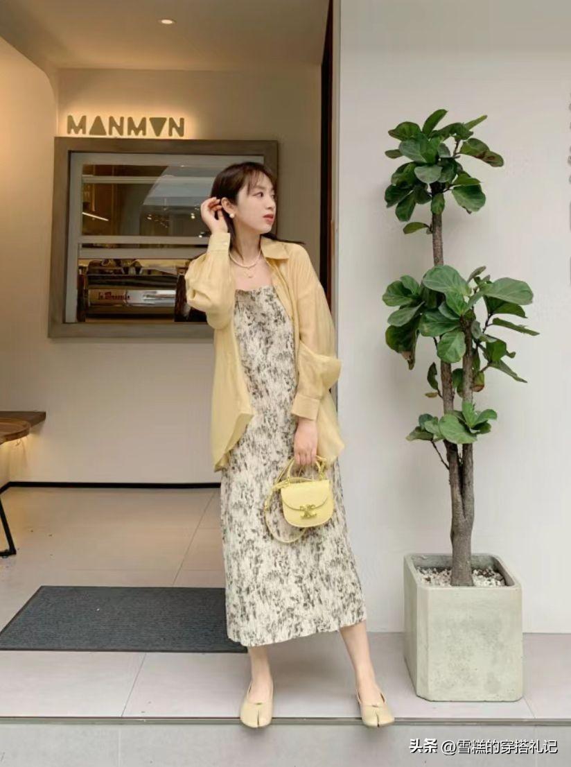 春天穿連衣裙的時候,建議大家可以用到兩種顏色,選裝大面積的覆蓋低飽和度的彩色調,比如霧霾藍、豆沙綠、香芋紫……在搭配上基礎色的配飾跟平底鞋,協調性自然很好。