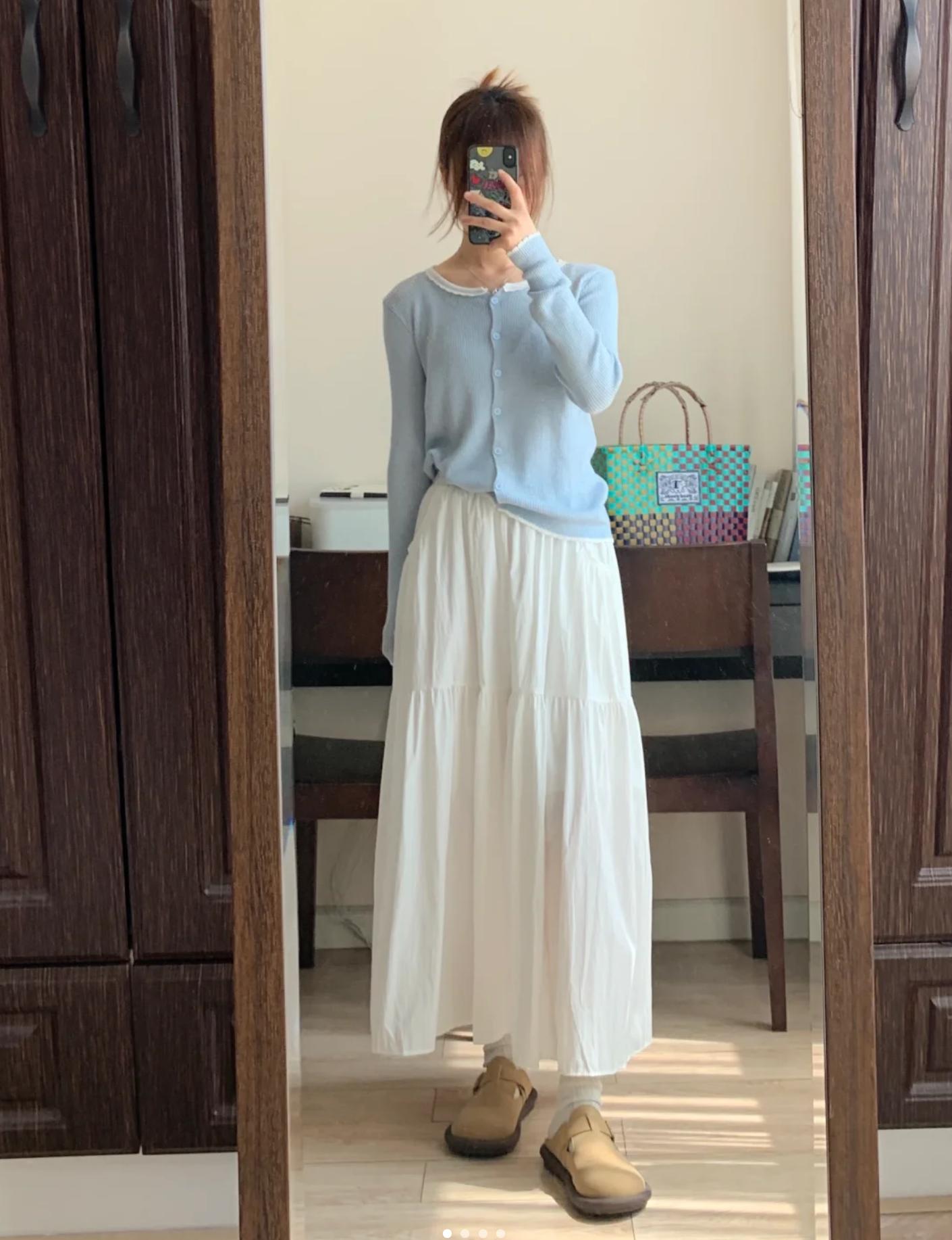 ①寬鬆適度的直筒裙,裙襬處有微妙的弧度,有褶皺設計、立體剪裁或適當寬鬆款式的裙子,既能遮掩贅肉,又能保持整體的流暢感。