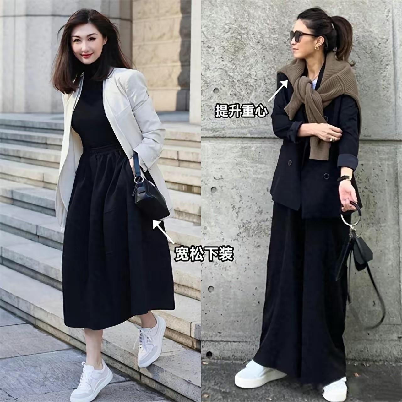 小廓形的西服外套,可以搭配修身的黑色連衣裙來穿着。黑色連衣裙是一種上緊下松的設計、簡約又提氣質。淺色系的西服外套,搭配黑色連衣裙,溫柔幹練且氣場十足。
