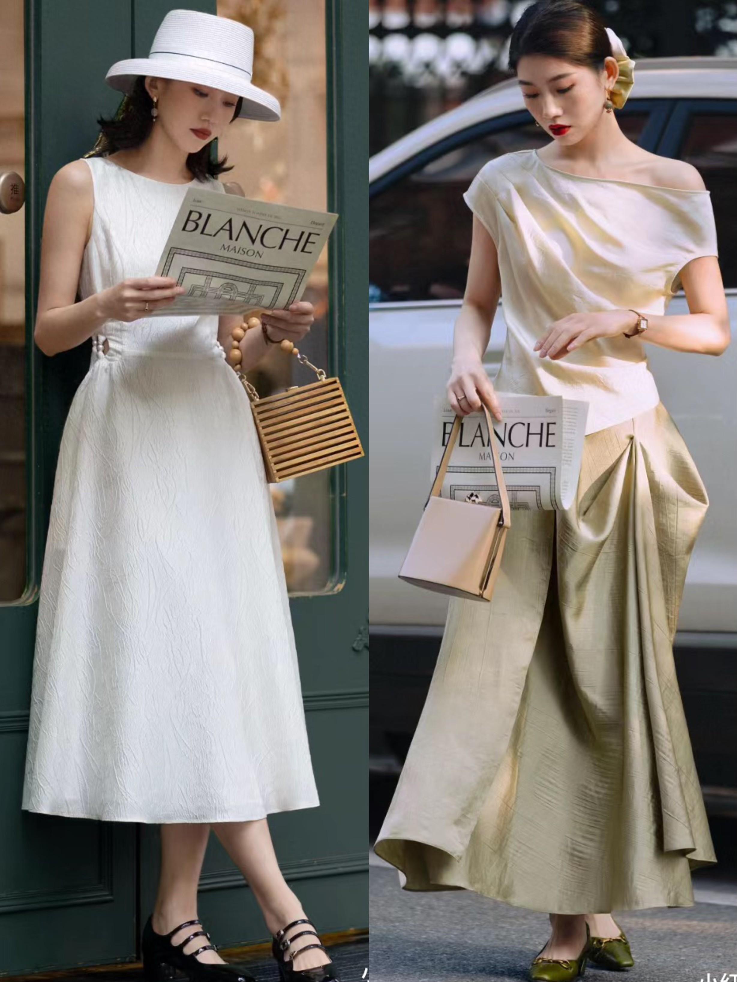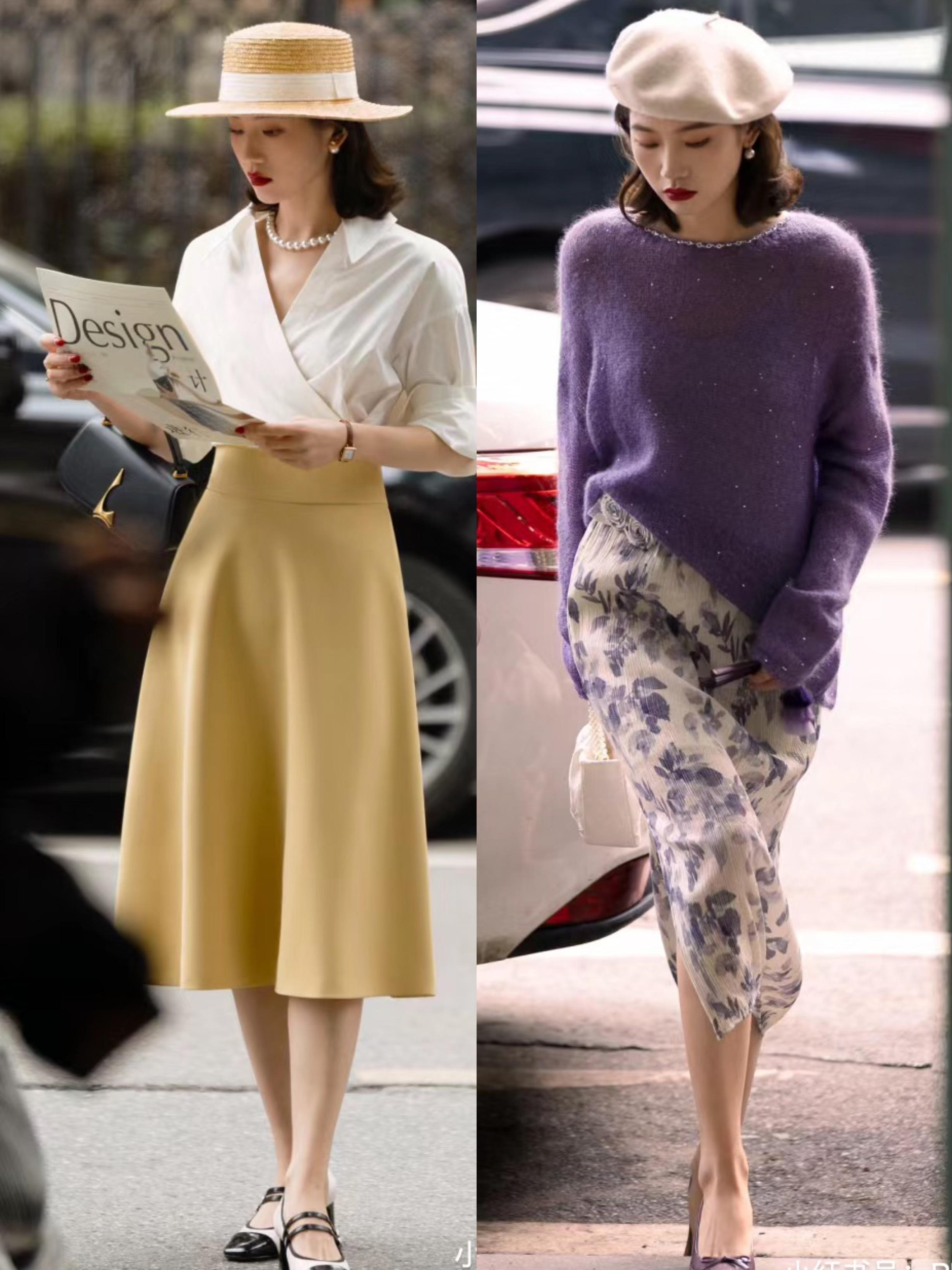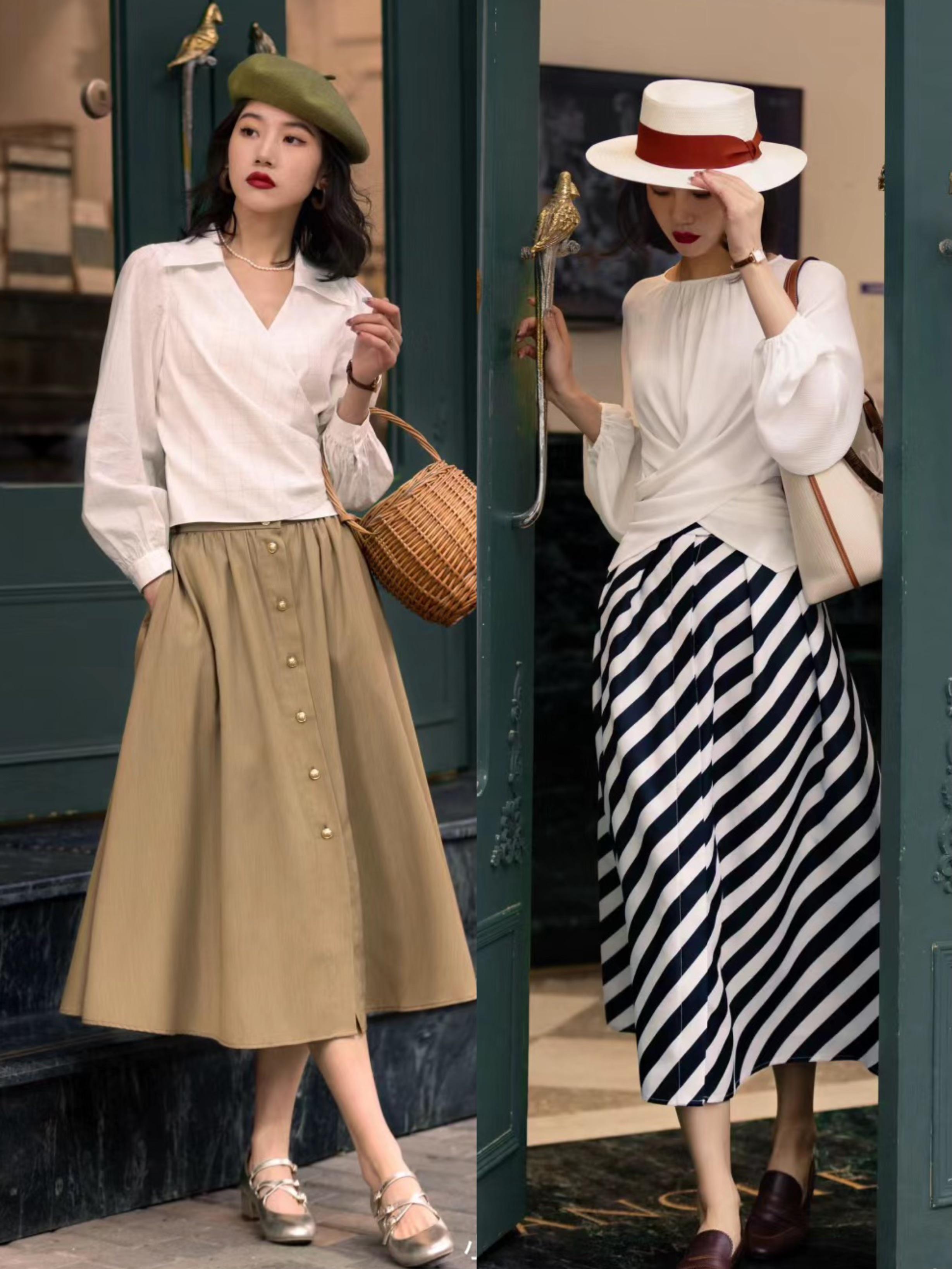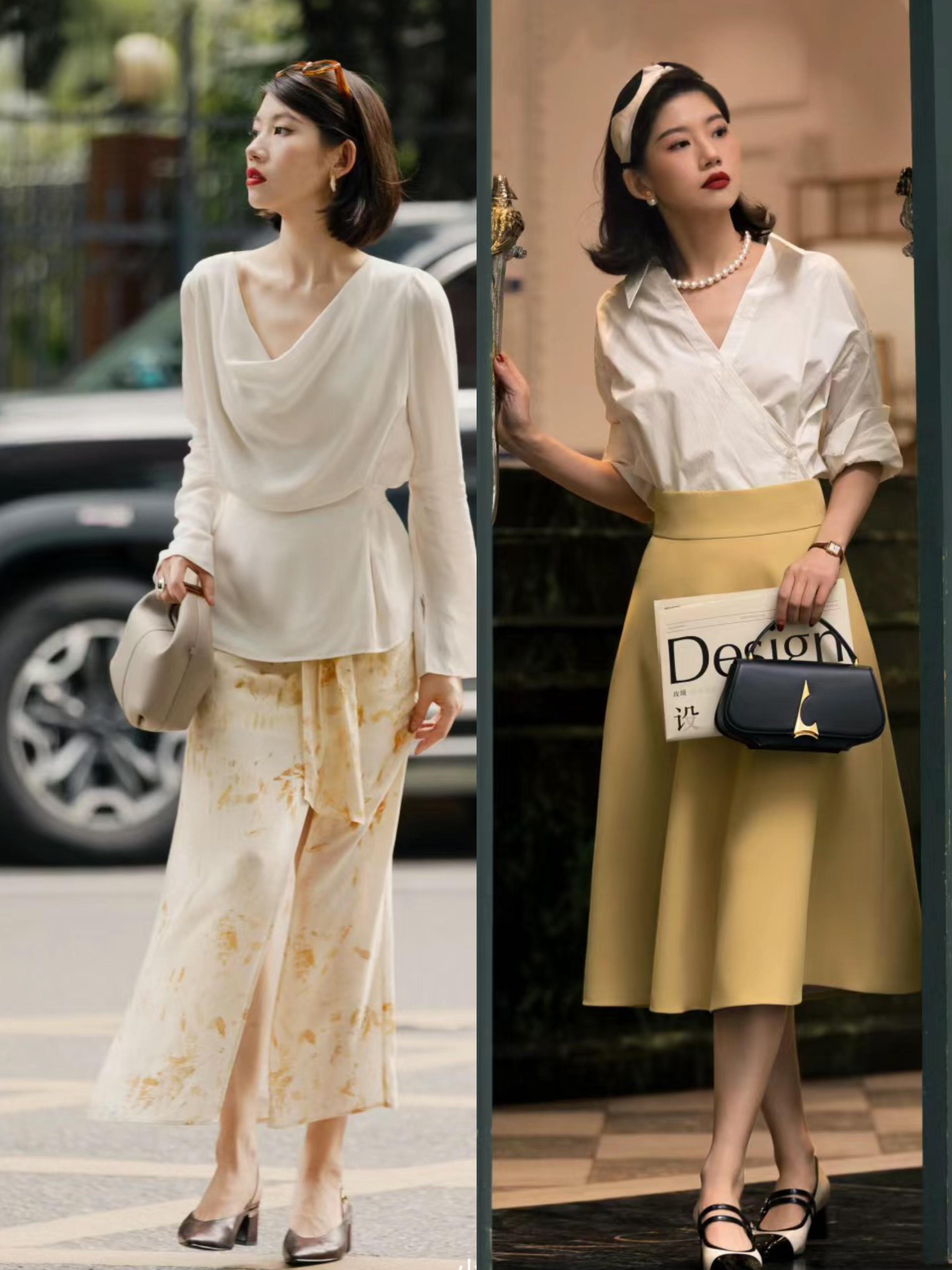 基礎又耐看的白色襯衫,搭一條高腰的薑黃色傘裙。清新又時尚的配色,給人一種高級醒目的美。這種圍裹式白襯衫,頸部少許露膚,配珍珠項鍊、也表現出女性的貴氣與優雅。