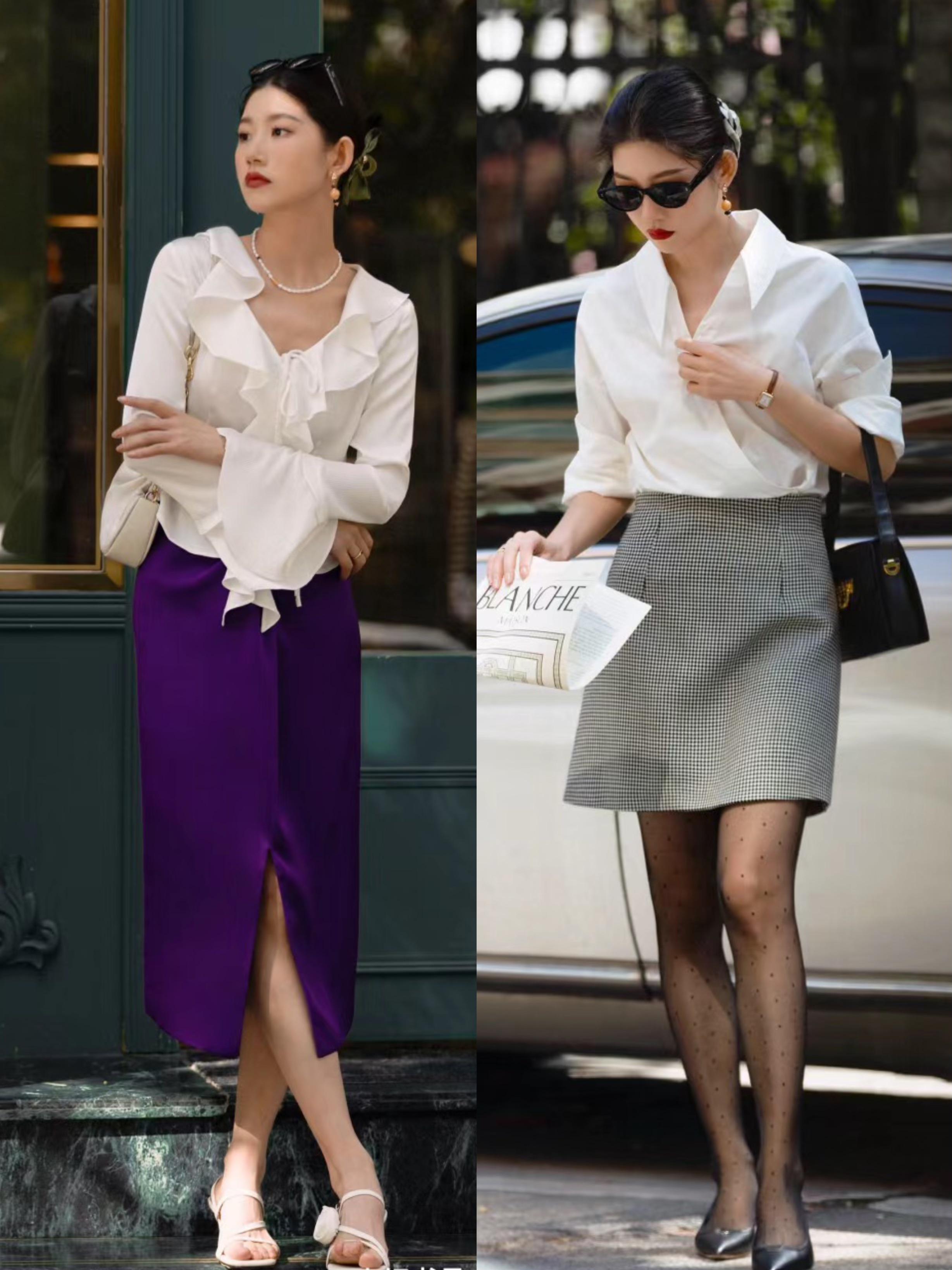 基礎款的服裝,稍微做一點改進,就可以生出萬種風情。讓簡約又日常的穿搭,變得分外醒目。比如稍微個性一點的白襯衫,我們可以配A字形半身裙來穿着。