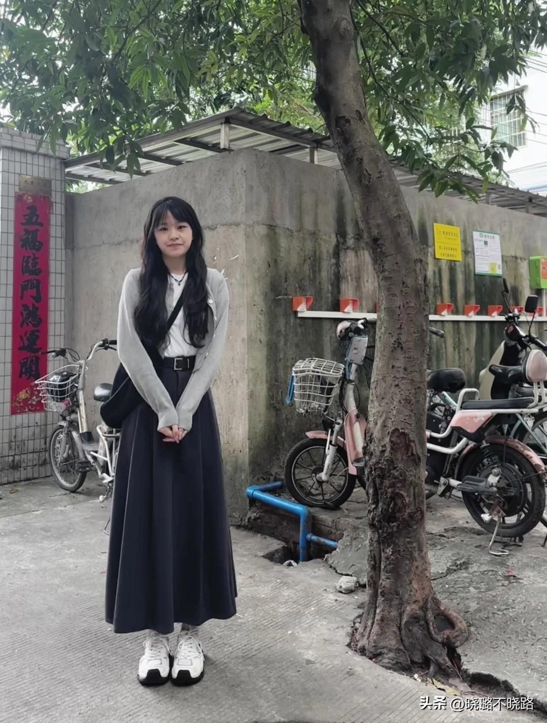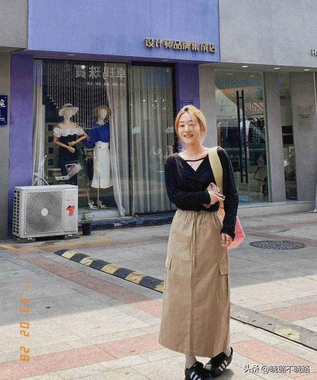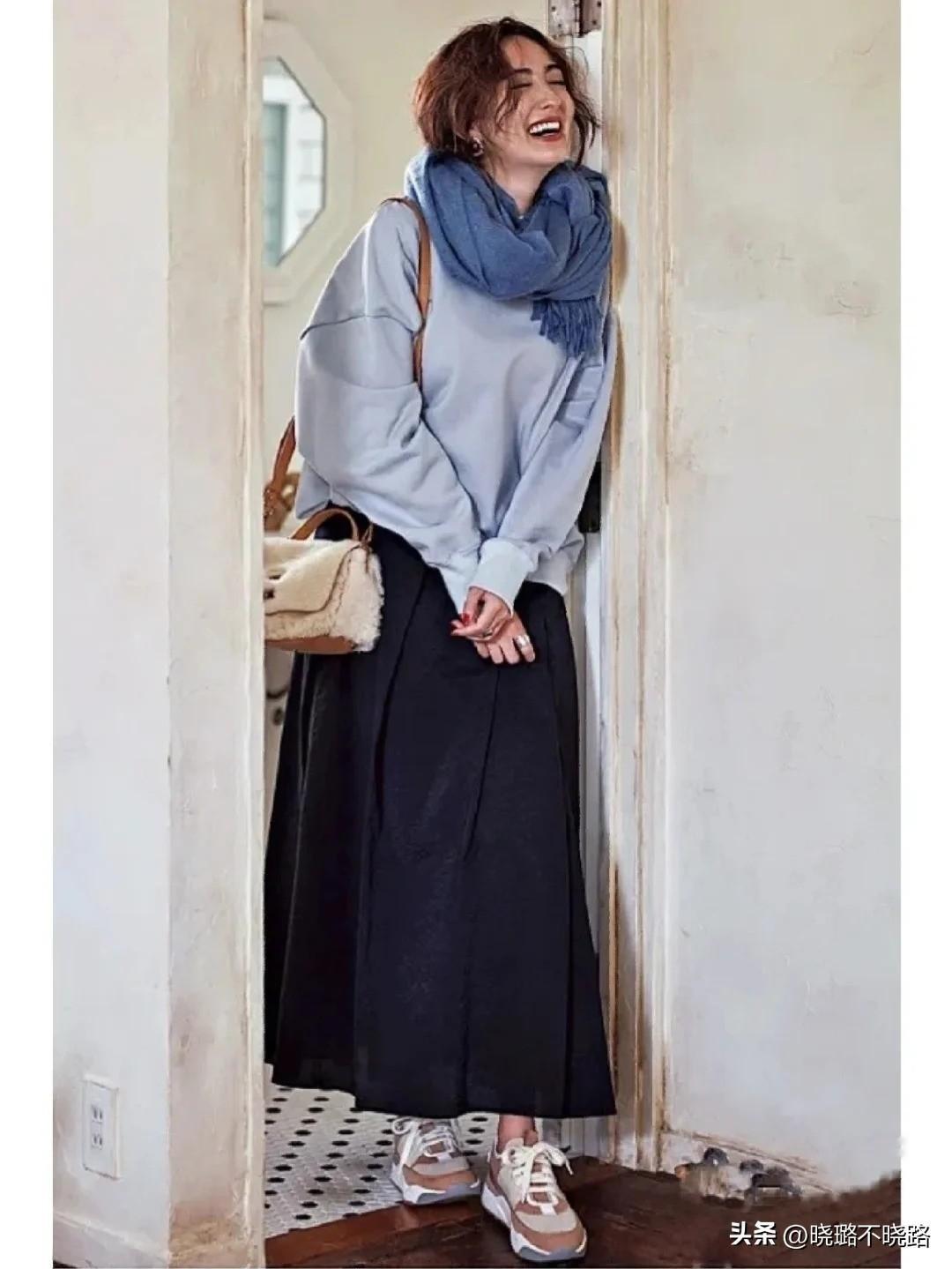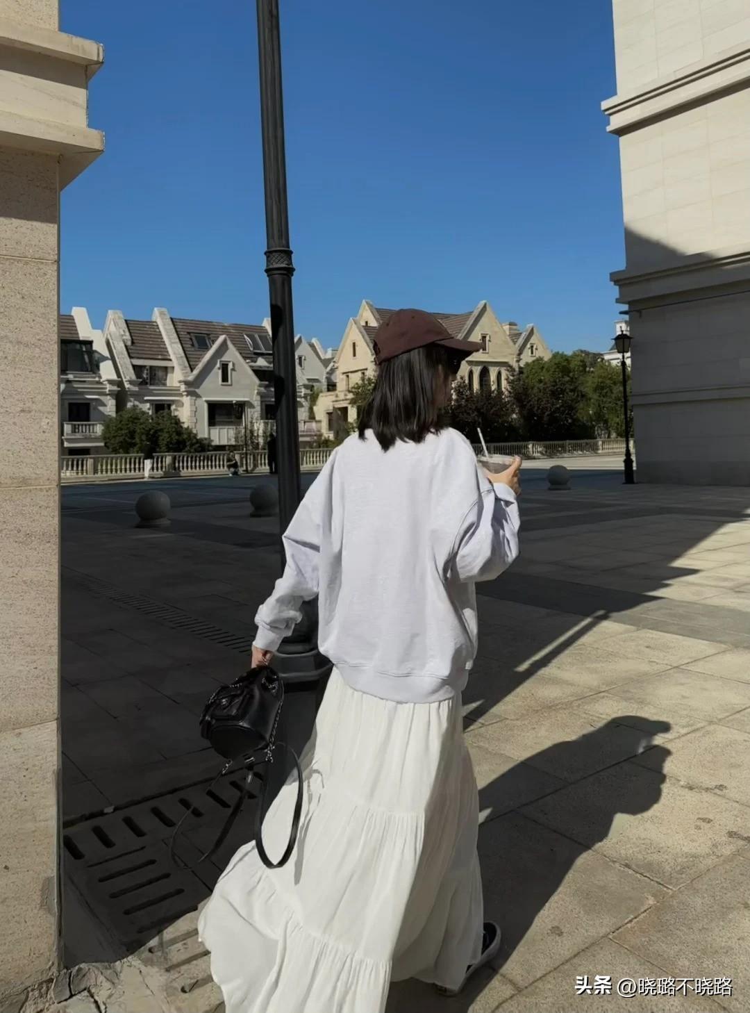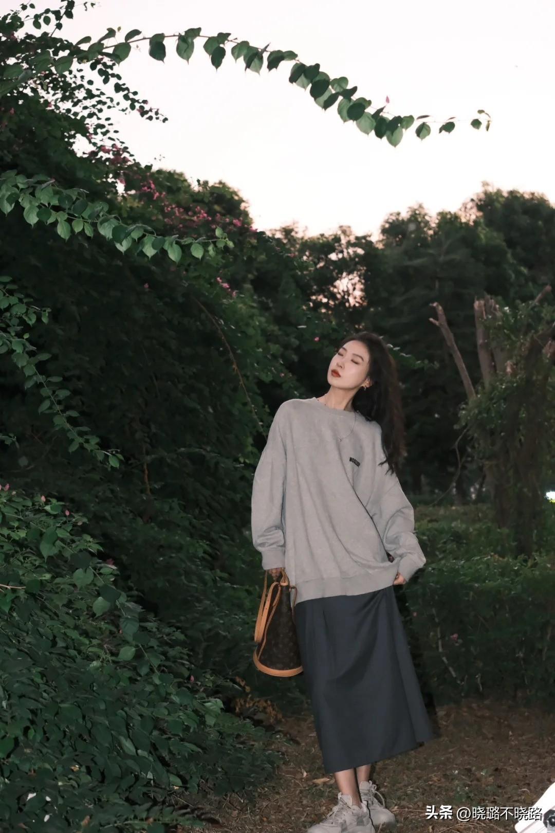 一件淺色的衛衣,給人一種休閒又隨性的味道,下半身利用一條偏長且帶着褶皺設計的奶奶裙進行對比。