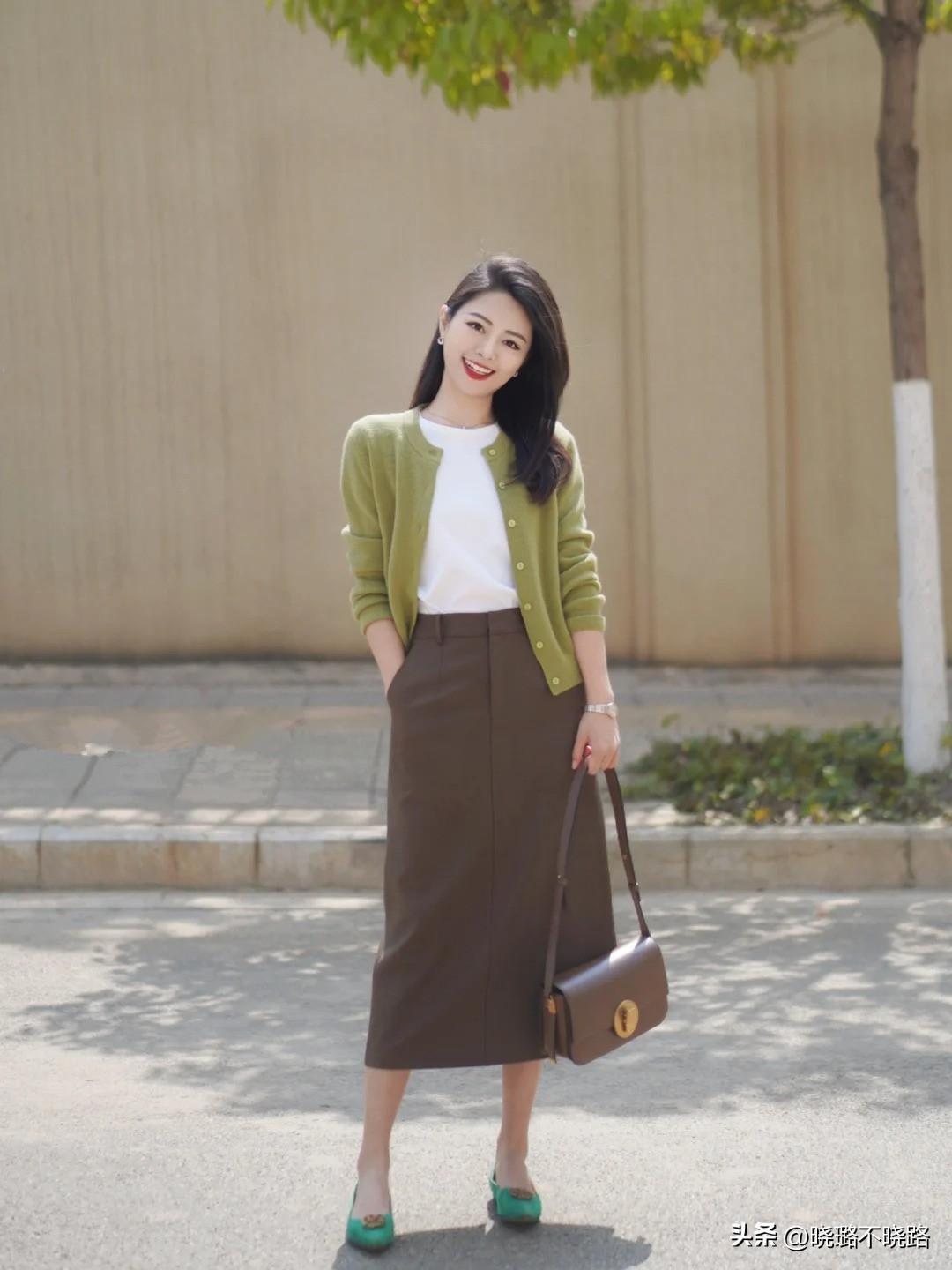 ☆通勤風代表:白色內搭+黃綠色針織外套+深咖色奶奶裙