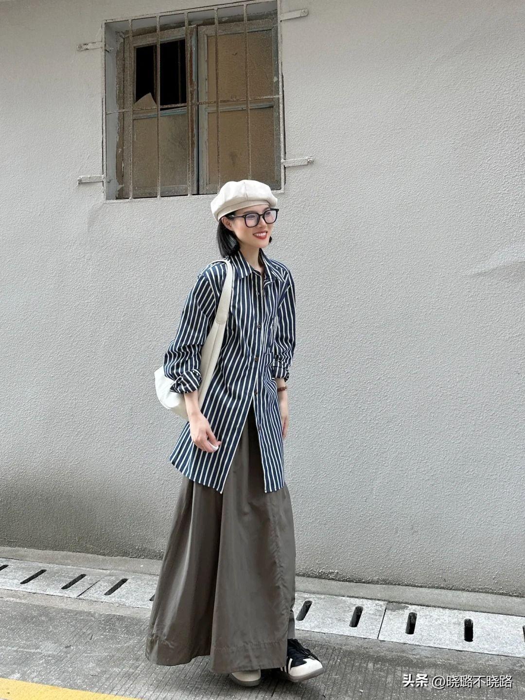 一件帶着豎形條紋的襯衫搭配軍綠色奶奶裙,雖然看似採用的元素不多,實際上卻很明顯爲上下製造出了繁簡的對比效果。