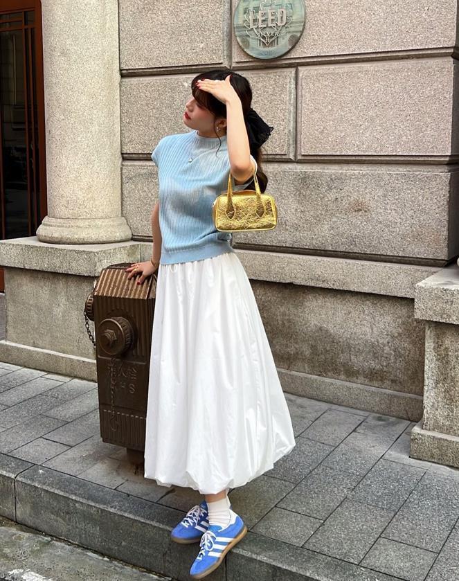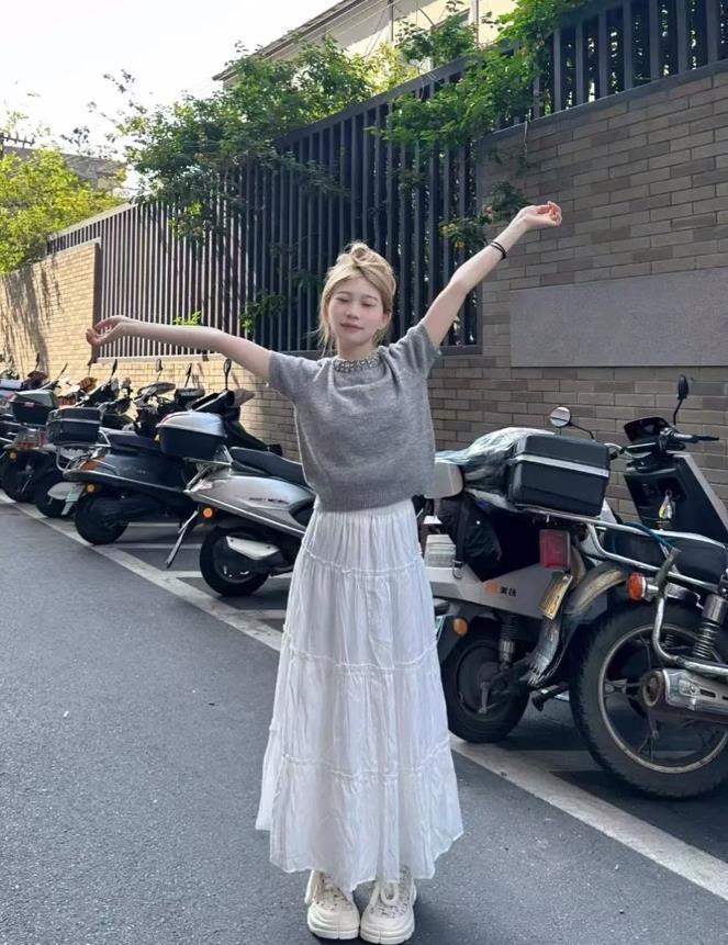 至於半裙的款式,其實最終決定在短袖針織上,只要選擇的款式是比較簡單的,那麼無論你配飄逸半身長裙,還是活潑的短裙,都可以完美融合在一起,特別是配短裙的時候,讓你看起來更顯青春活力。