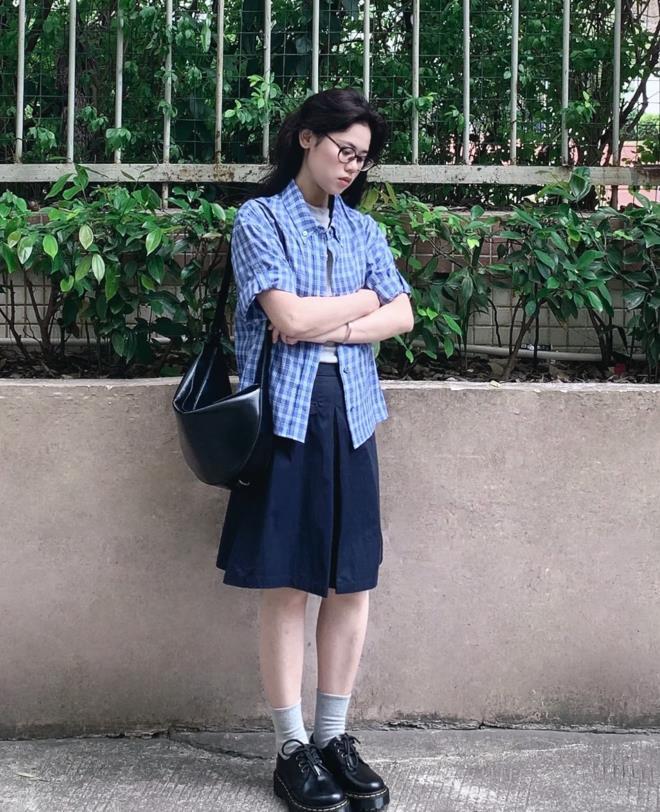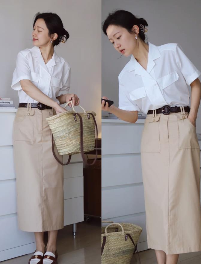 短袖襯衫+半裙,不僅能展現出屬於女性的優雅氣質,還能夠拉長身材比例,提高腰線比例後,就可以讓我們的身材看起來更加高挑。