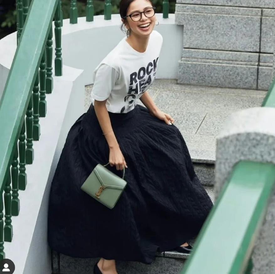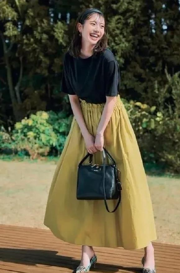 短袖t恤配a字半身裙,可以展現出一種氣質和隨性的效果,當然,在這種版型的加持下,胯寬大腿粗的缺點也可以得到改善。你可以選擇顏色素一點的短袖t恤來配深色半裙,越是簡約越高級。