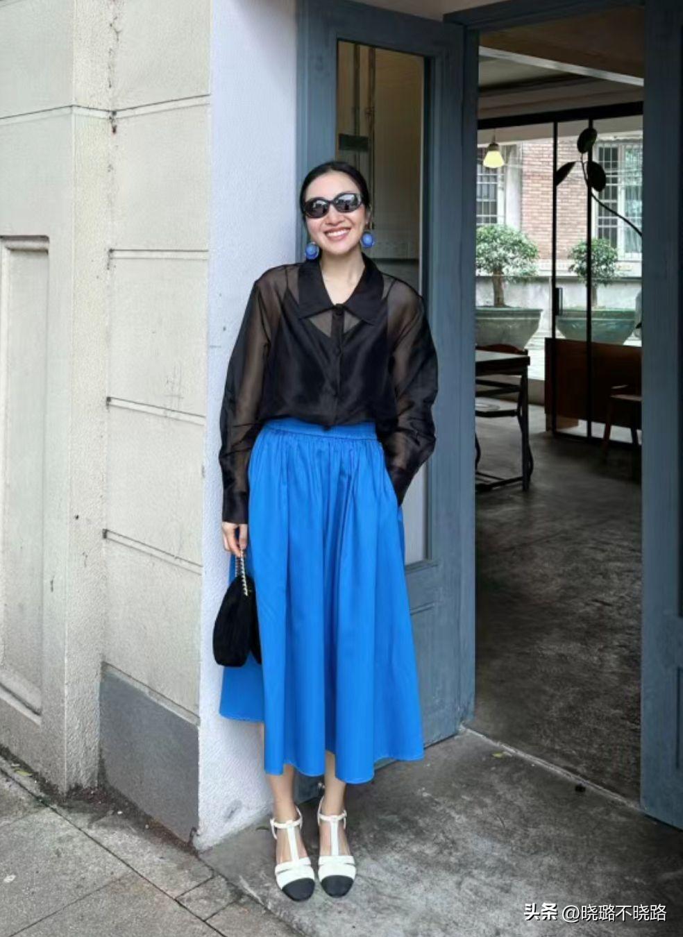 •適當留白:寶藍色傘裙和黑色透視襯衫的組合,應當適當的露出肌膚線條,比如踩上一雙黑白拼接的涼鞋,露出腳背和腳踝線條;襯衫的領口要露出鎖骨,再加上透膚的襯衫材質,會更有女人味。