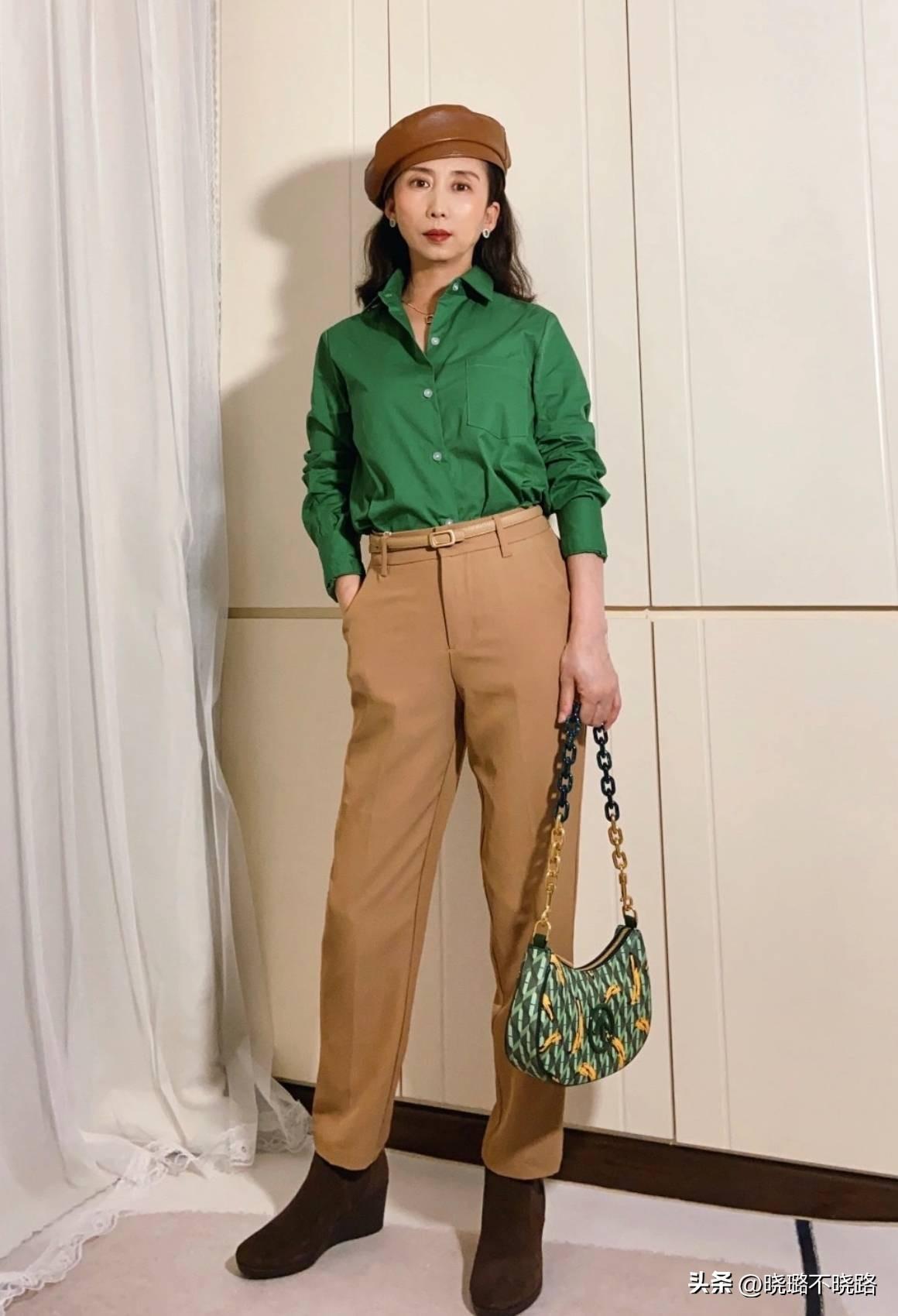 將墨綠色的襯衫解開一兩顆釦子穿,搭配金屬款式的鎖骨鏈,精緻又時尚;下裝則可以選擇卡其色的九分西裝褲,配上同色系的咖色貝雷帽,復古又高級。