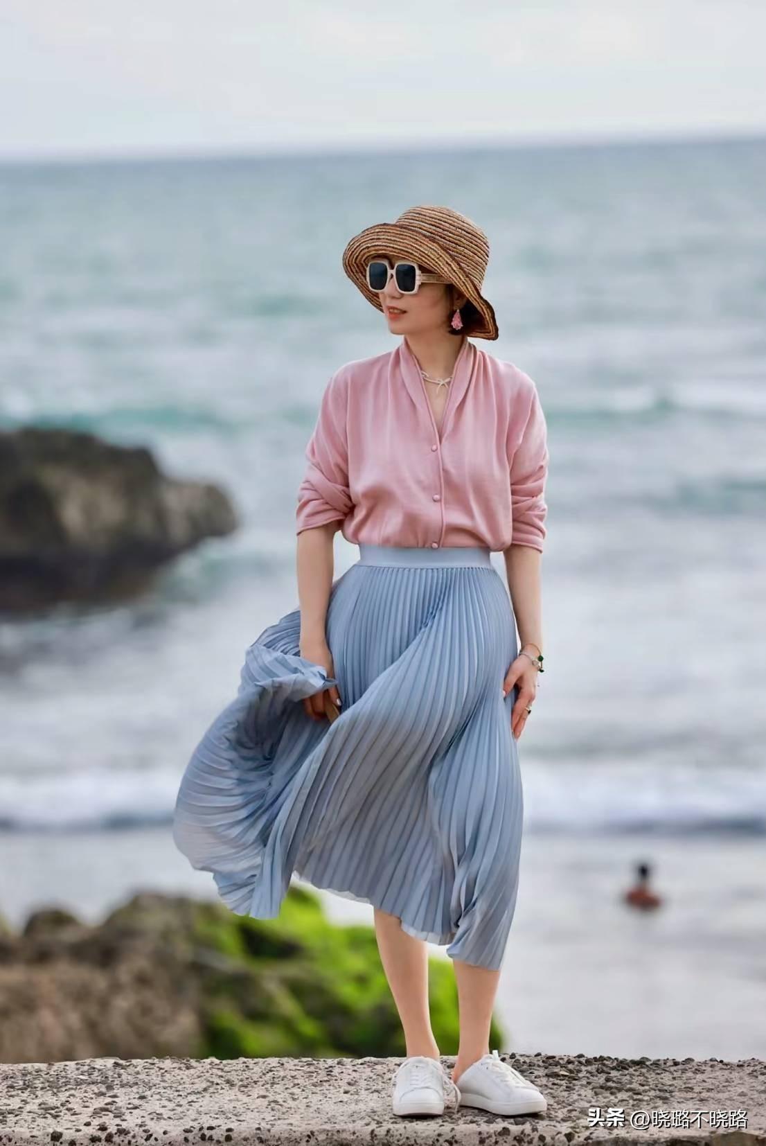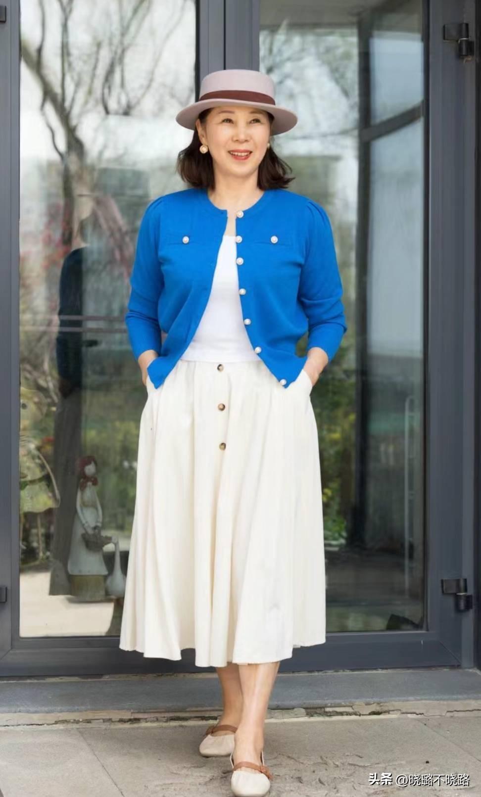 •上衣疊穿:踏入中年階段的女人,要學會上衣疊穿的方式,尤其是在春夏季節,選擇一件白色修身吊帶,疊穿寶藍色針織開衫,將針織開衫敞開穿,露出內搭更有層次。