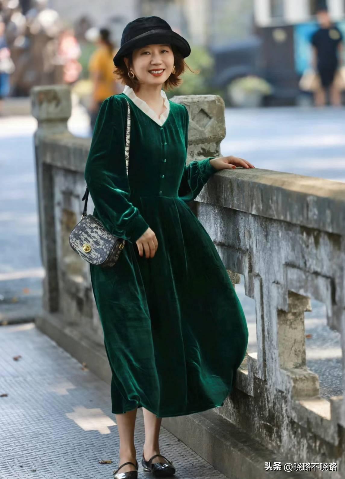 搭配墨綠色絲絨長裙的時候,配飾和鞋子影響力也是很高的,選擇一頂簡約款的黑色圓形漁夫帽,去隱藏髮量少和抬頭紋的問題,最後纔算一雙平底款式的搭扣小皮鞋,舒適感十足。