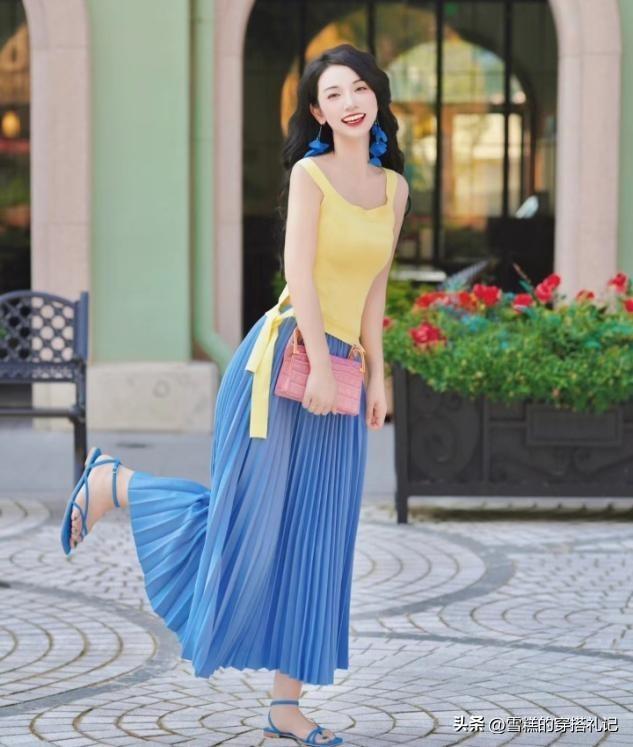 那些高亮的黃色以及白色的運用,儘可能穿在上半身,去形成視覺上貼近面部的提亮效果,偏深的色彩點綴長裙或者長褲,形成明暗色調的交替效果,體型纔不容易顯得肥大。