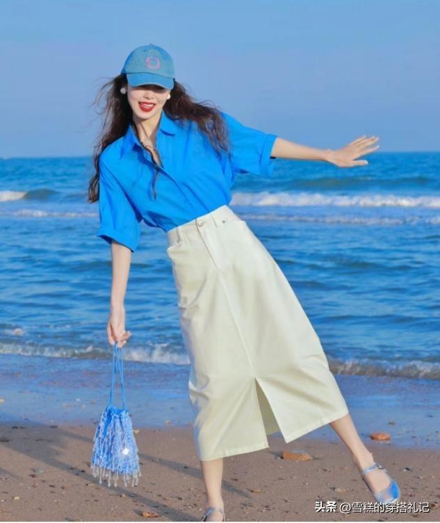 在滿眼的彩色系造型當中,比較適合我們去隨性疊穿的有清爽的天藍色,這是一種能夠襯托黃皮膚色亮度的顏色。當下特別流行藍白的兩類配色,利用色彩的銜接效果來營造出視覺上的亮度,日常偏向通勤款式的襯衫或者褲子會顯得更加利落得體。