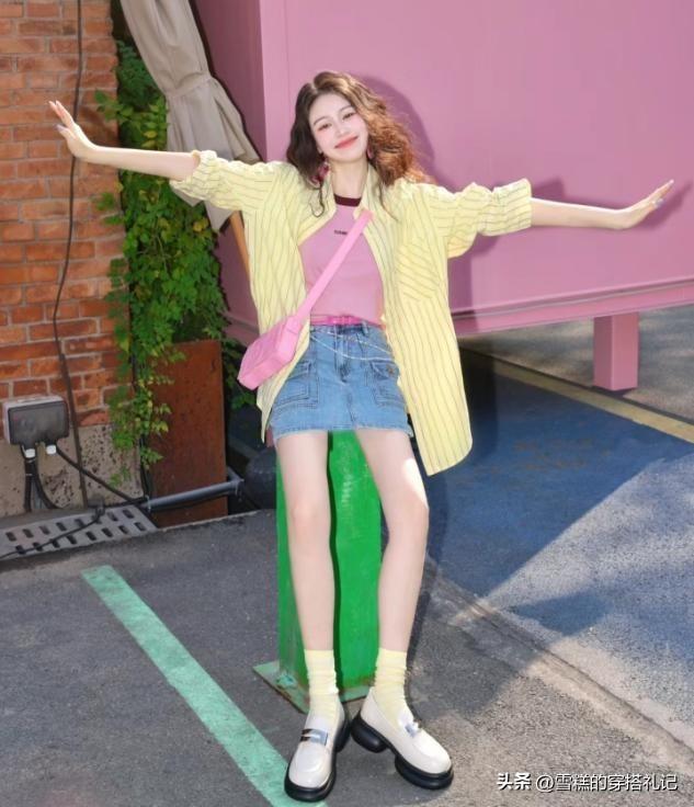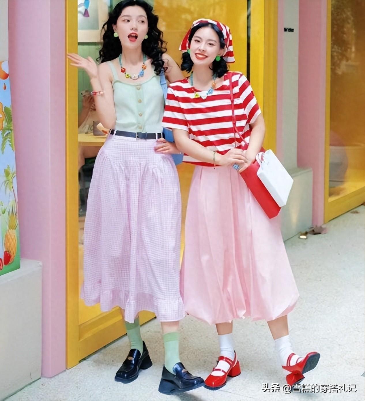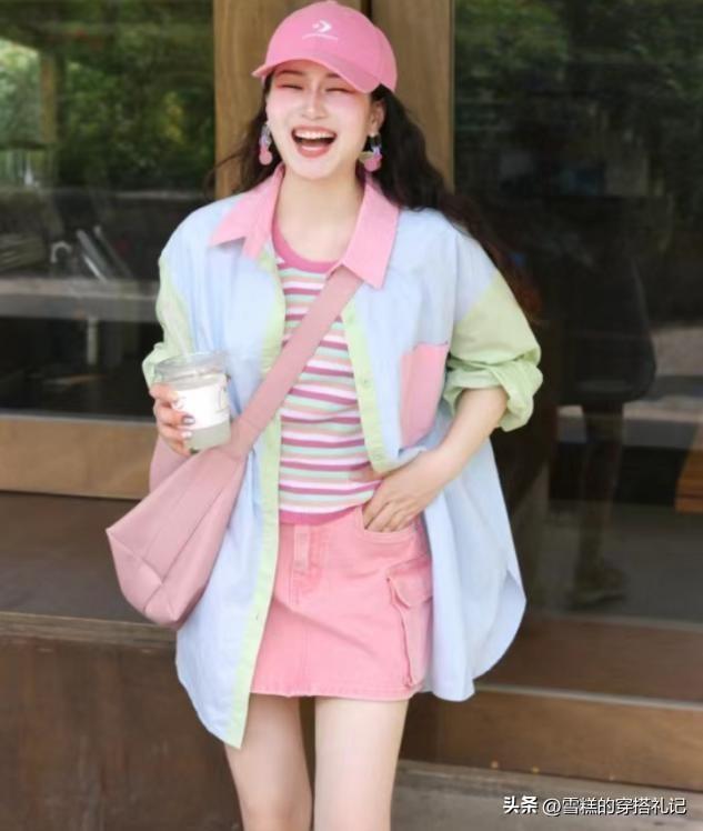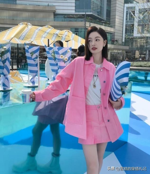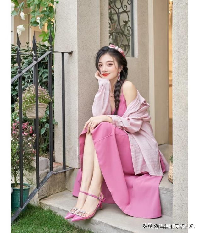 同種色彩運用在一套造型當中,同樣也適合多巴胺色彩的匹配,以粉色系作爲推薦,開衫和裙子就可以形成深淺遞進。