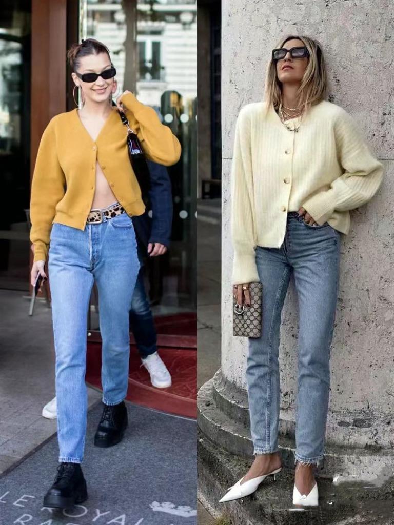 短款的針織衫,可以搭配高腰的牛仔褲。高腰的直筒牛仔褲,稍微修身的款式、可以更自然的修飾腿型。我們用直筒牛仔褲,配厚底的皮鞋、或者運動鞋都更顯高。