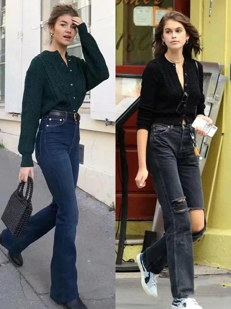 “奶奶衫+牛仔褲”,溫柔大方還顯腿長