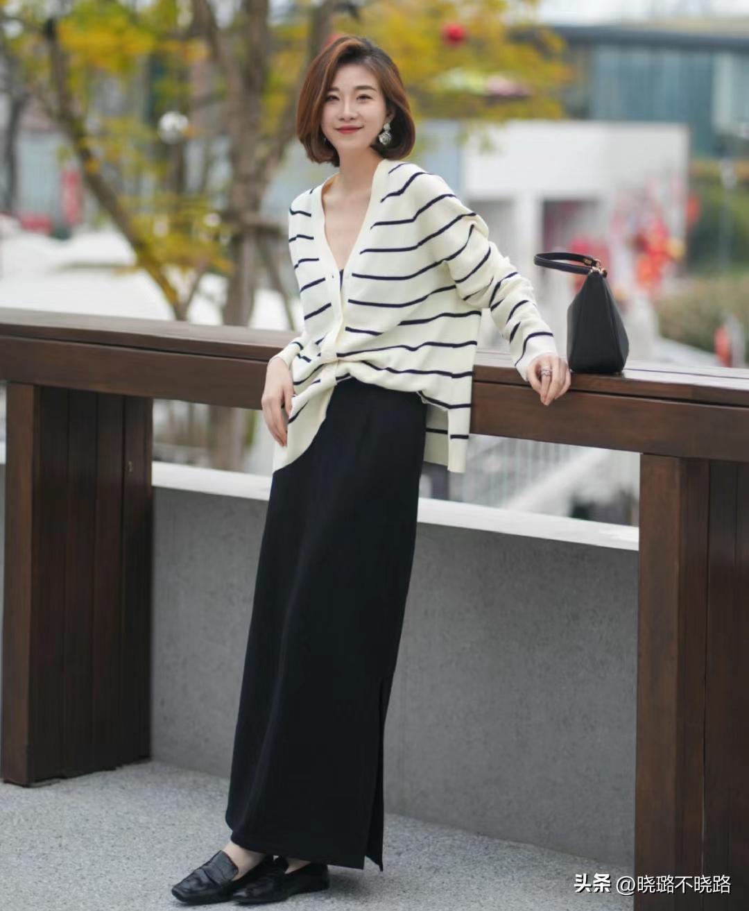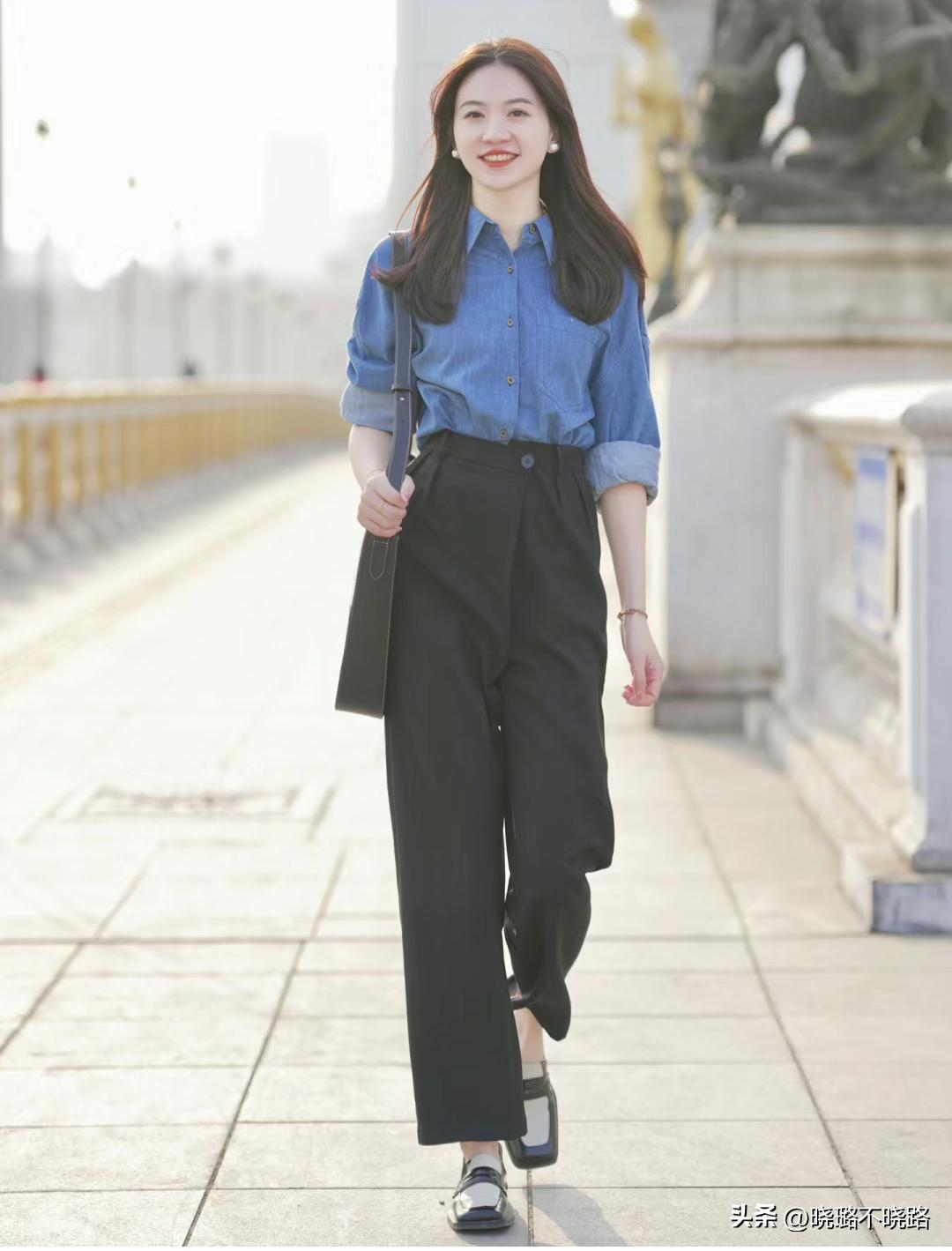 想要突出下半身的延伸效果,大家也可以多試試整體的配合,直接選擇一雙帶有尖頭設計的樂福鞋或者瑪麗珍鞋等等,在窄長褲筒和尖頭鞋子的配合下,拉長腿長的佔比,營造了二八比例,看着會更加的利落洋氣,而且如果闊腿褲帶有高腰的設計,上身會更加利落。