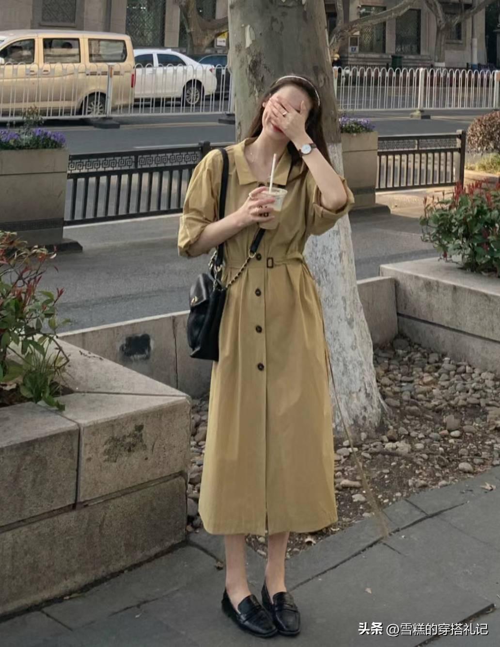 在搭配繫帶款式的槍駁領風衣時,建議大家內搭可以選擇風格知性一點的襯衫裙,簡約利落的白色襯衫裙,露出領口和衣襬,可以和風衣組合出十分豐富的效果。