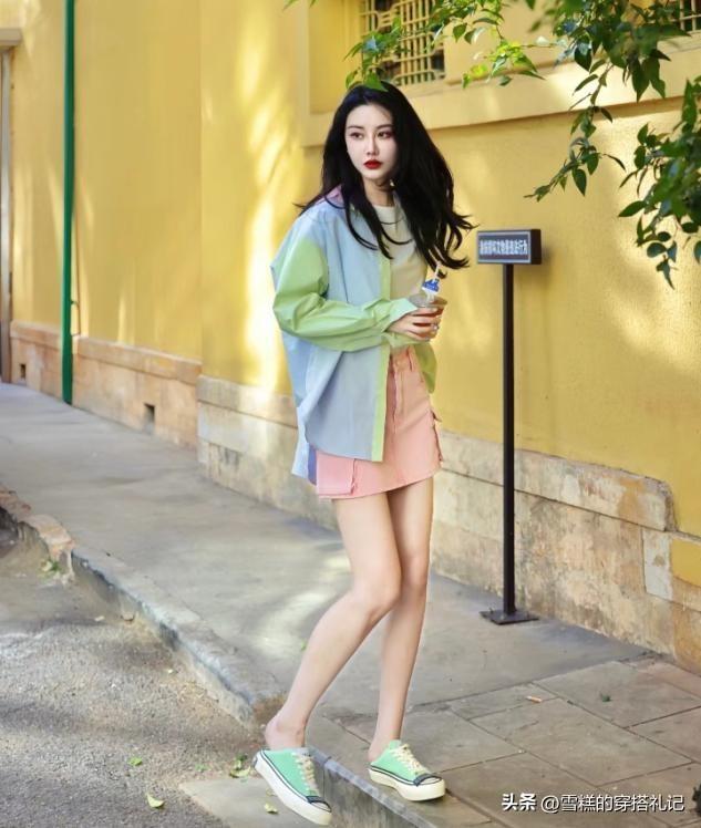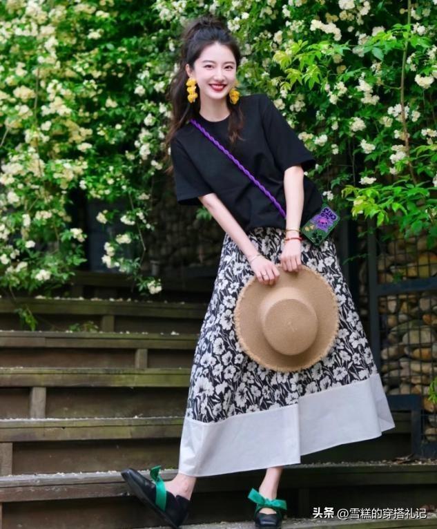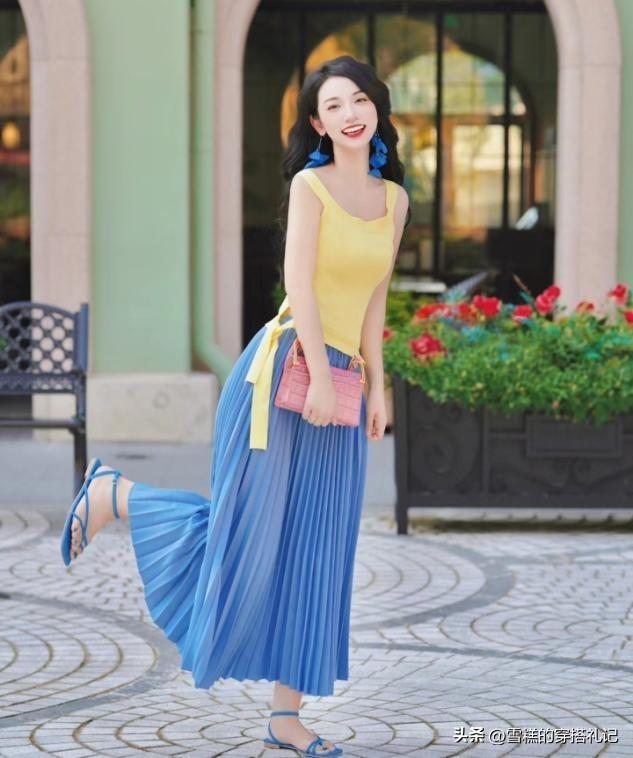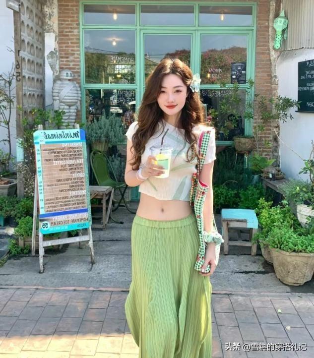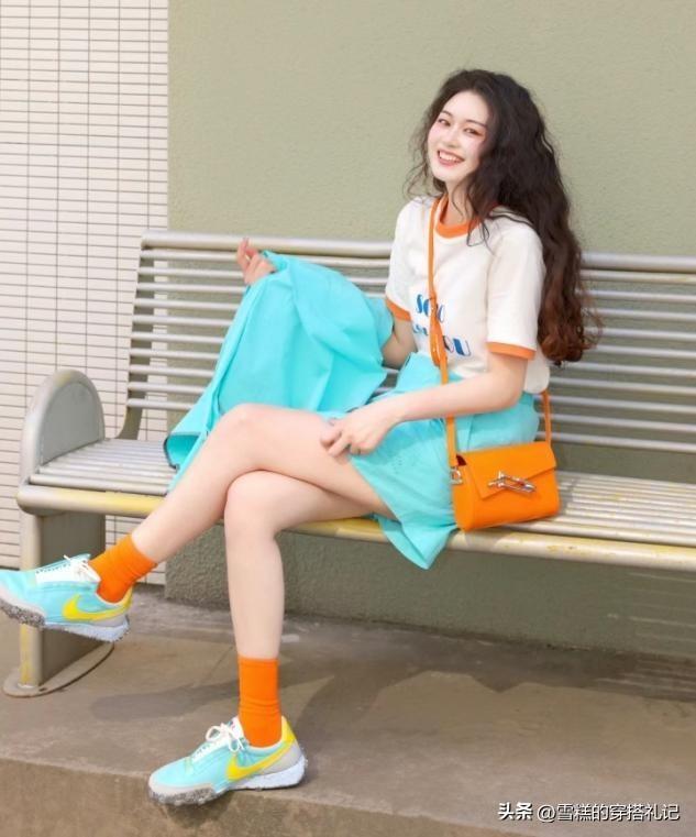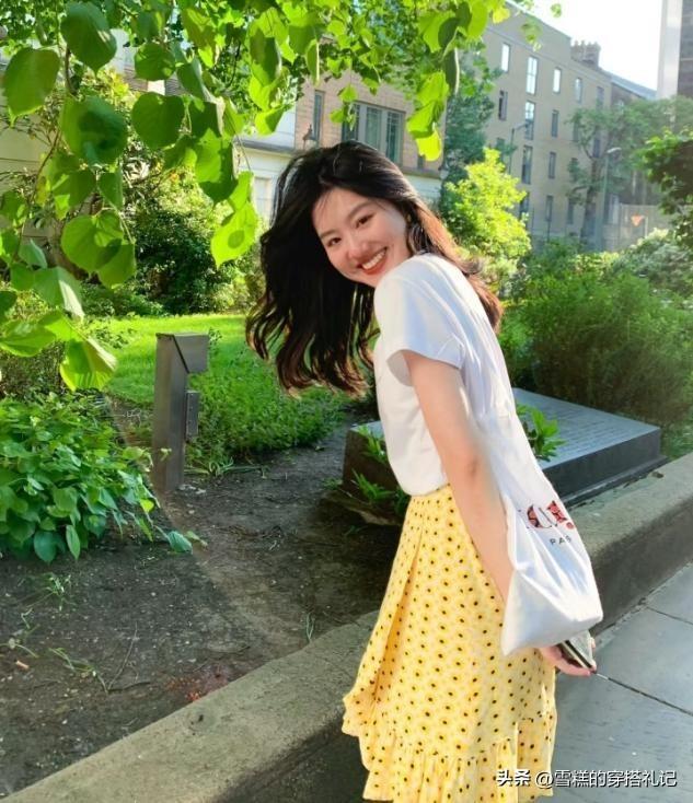 素色系的上衣穿搭特別適合彩色裙裝,尤其是白色或者米白色的穿法,如果是一面光的T恤上衣,整體穿衣就會歸於簡單,但是彩色系的裙子又彌補了這一弊端,可以穿出一種粉簡相襯的視覺對比效果。