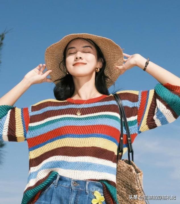 本身就具有條紋或者說色彩拼接的T恤上衣,瞬間就抓住了造型當中的突破點。那麼,單色系的褲子和裙子作爲匹配,就可以讓整體造型有分寸感,不顯得累贅。