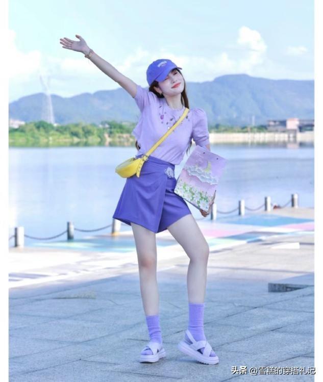 溫和又減齡的彩色系並不一定要選擇粉色,因爲粉色對於黃皮膚女生並不友好,想要減齡的話,香芋紫色是優選,而且點綴在T恤上,更適合那些超短的款式,方便我們去穿出一種俏皮可愛的鄰家氣質。