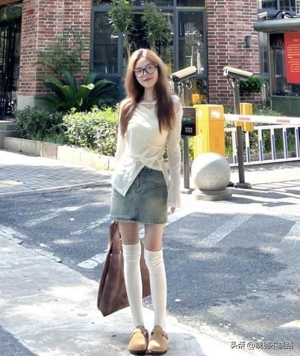 建議1:不規則款上衣+牛仔短裙,結合長筒襪