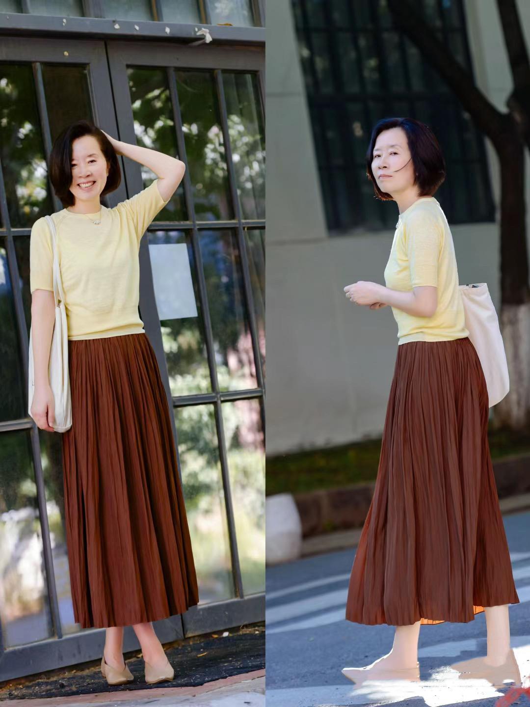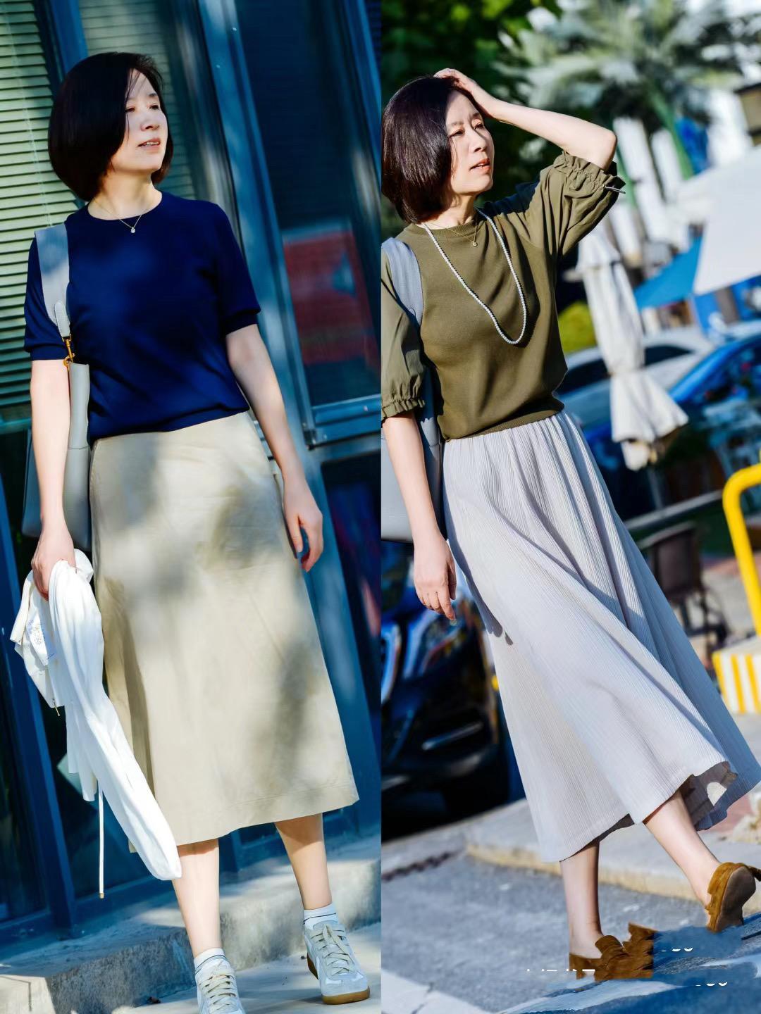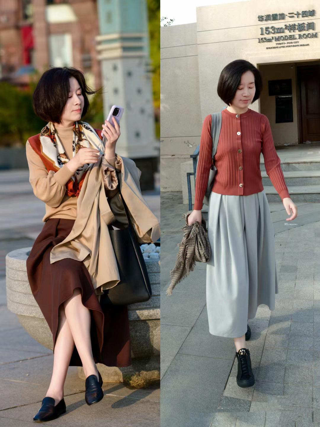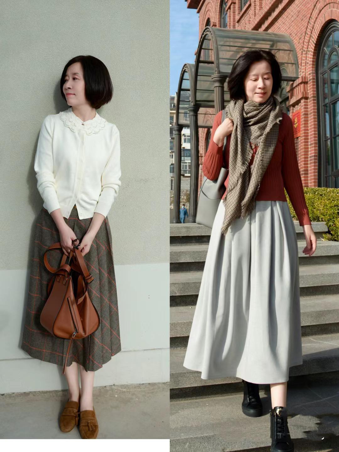 收腰或者修身的針織衫,都可以配大量感的半身裙來穿着。視覺上是一種上緊下松的效果,對於50+女性來講,也更具備了包容性。