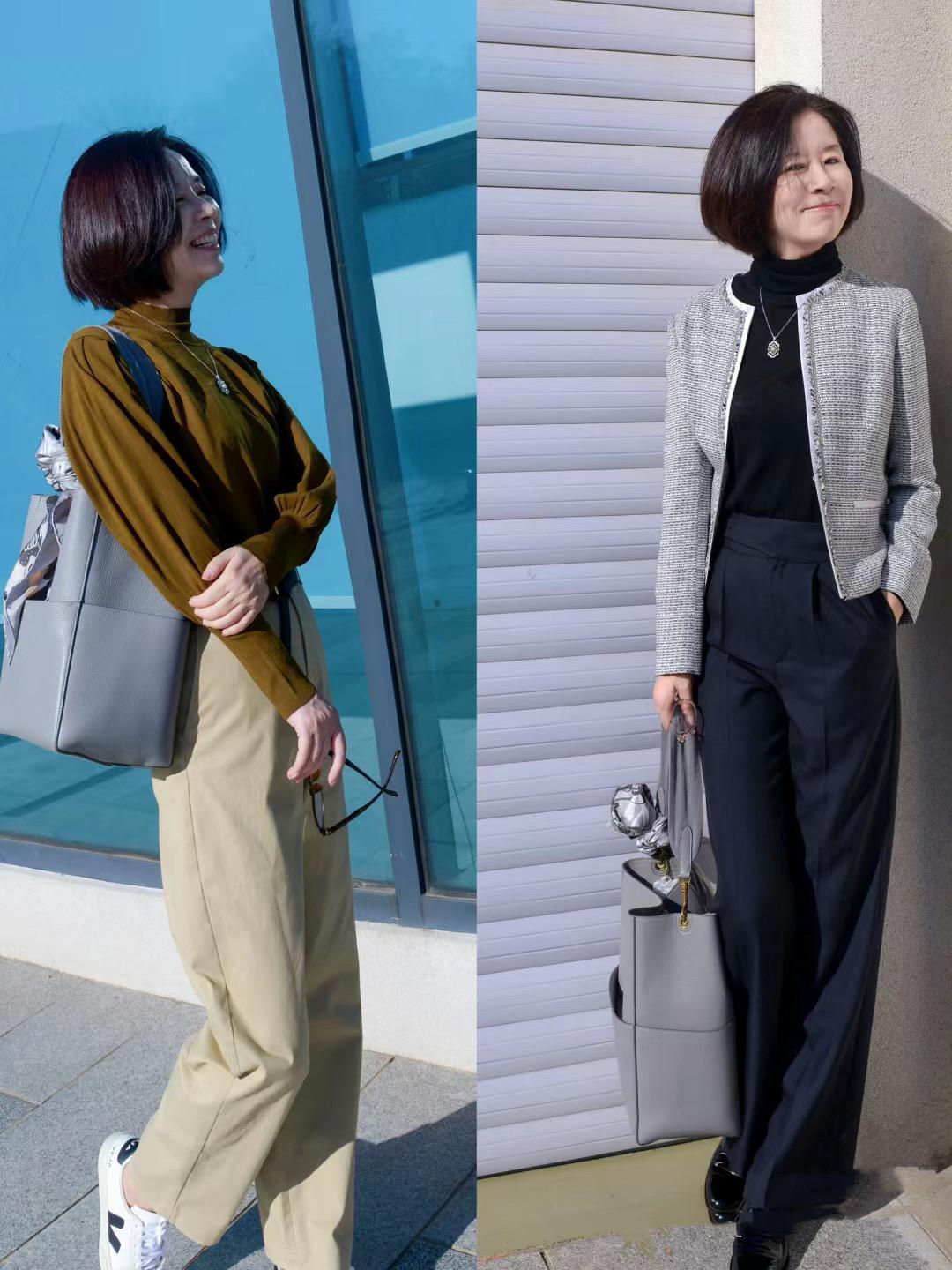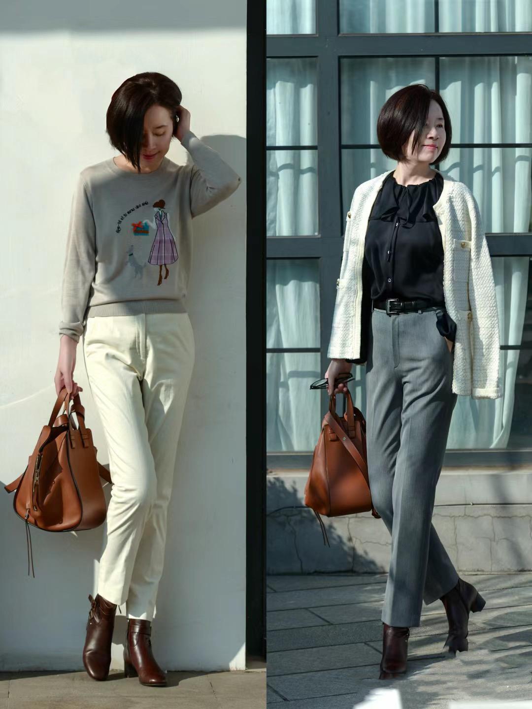 日常的穿搭中,我們可以選擇休閒風、無年齡感的單品來凹造型。比如襯衫、針織衫、小香風外套、西服外套、西裝褲、錐形褲、小皮鞋等等,都可以提升穿搭的精緻感。