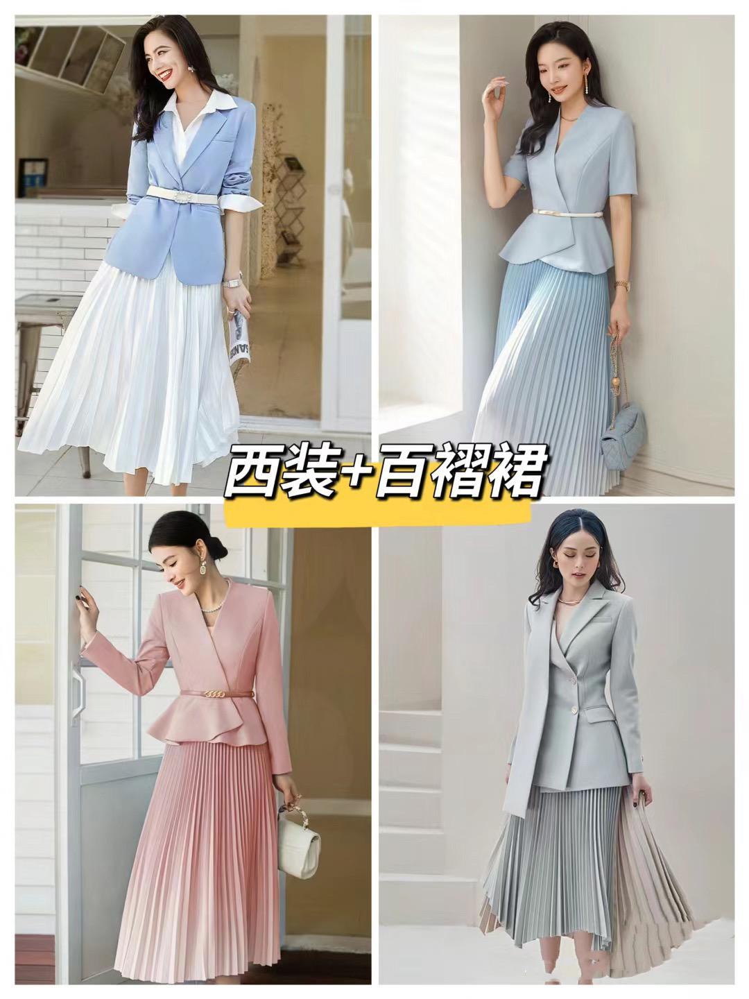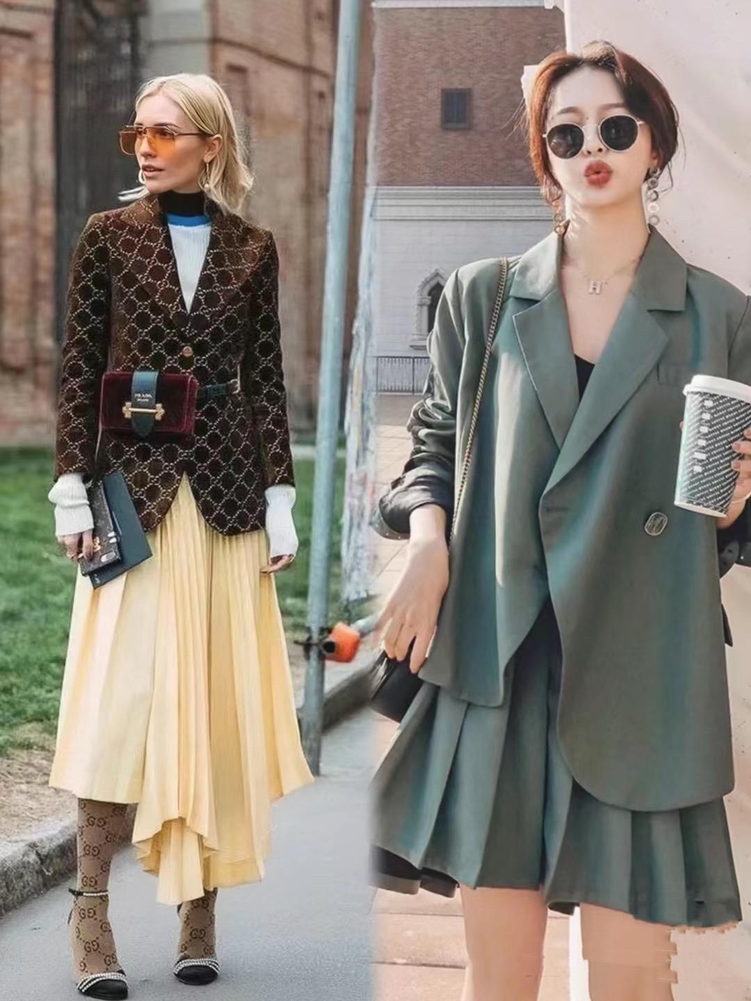 春夏季節的西服外套,可以與百褶裙完美組合。長款的百褶裙,配合個性的剪裁,就會有一種更加浪漫優雅的氛圍,對於身體的包容性也更強。