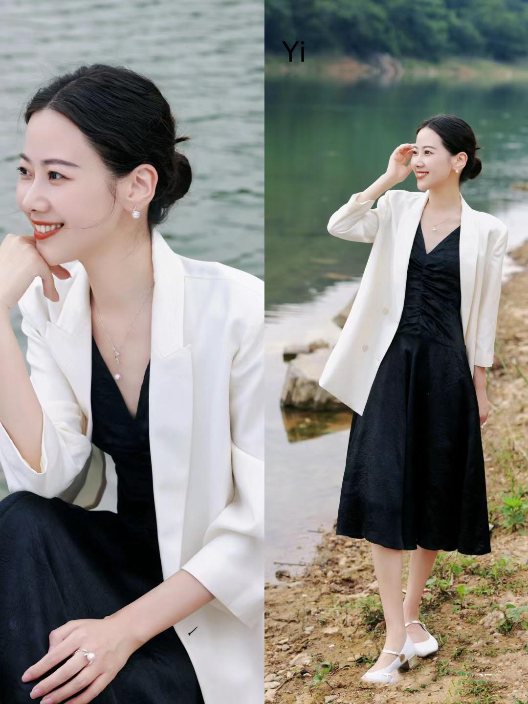 春夏季節非常實用的一組搭配公式,就是西服外套+百褶裙的組合了。淺色系的西服外套,更加溫柔嫺靜,疊搭同色系或者鄰近色的百褶裙大方且溫柔。