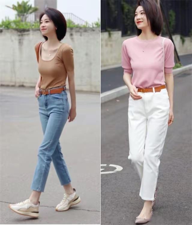 短款的上衣,修身的剪裁,把豐腴飽滿的體型呈現出來。搭配相對挺闊的齊踝褲,簡單又利落。修身的T恤,微彈的面料,也舒適自在。修身T恤,可以配淺色系,更加溫婉柔和。