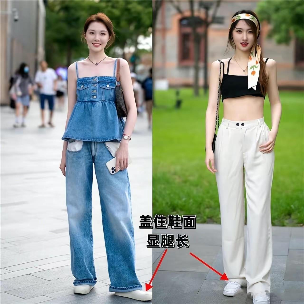 其實這裏是有一個小技巧的,只需要用褲筒蓋住一半的鞋面,視覺上就是最佳比例,拉伸腿長不拖沓,顯高效果更明顯。配平底的板鞋,也舒適自在。春夏季節,白色板鞋耐穿還洋氣。