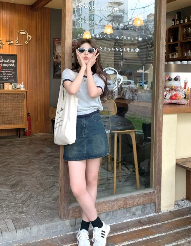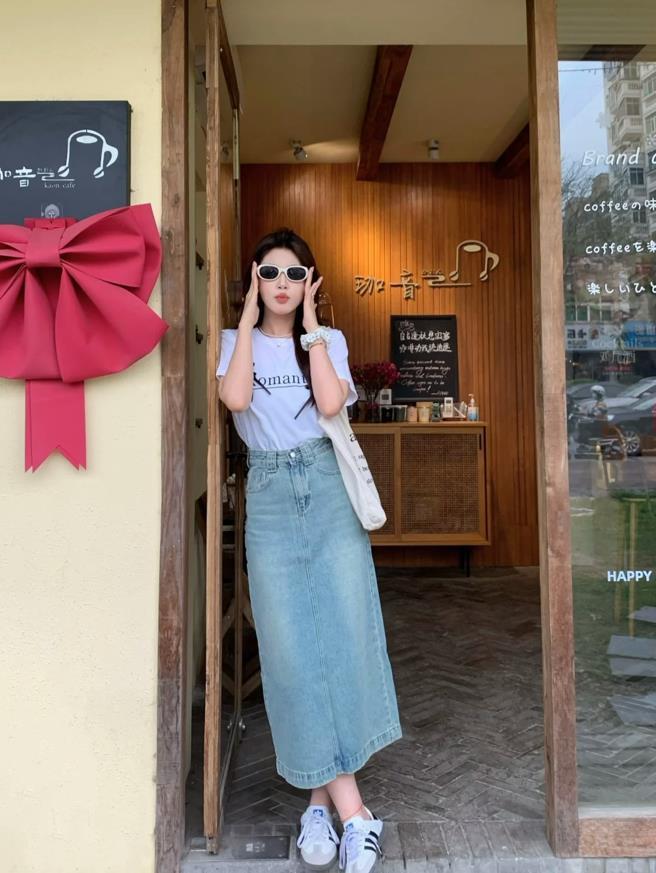 對於身材比較矮小的姐妹來說,應該選擇一條膝蓋以上長度的牛仔半裙,提高腰線後就很好拉長腿部線條。簡單搭配一件短袖t恤,就能打造出青春活力氣息。