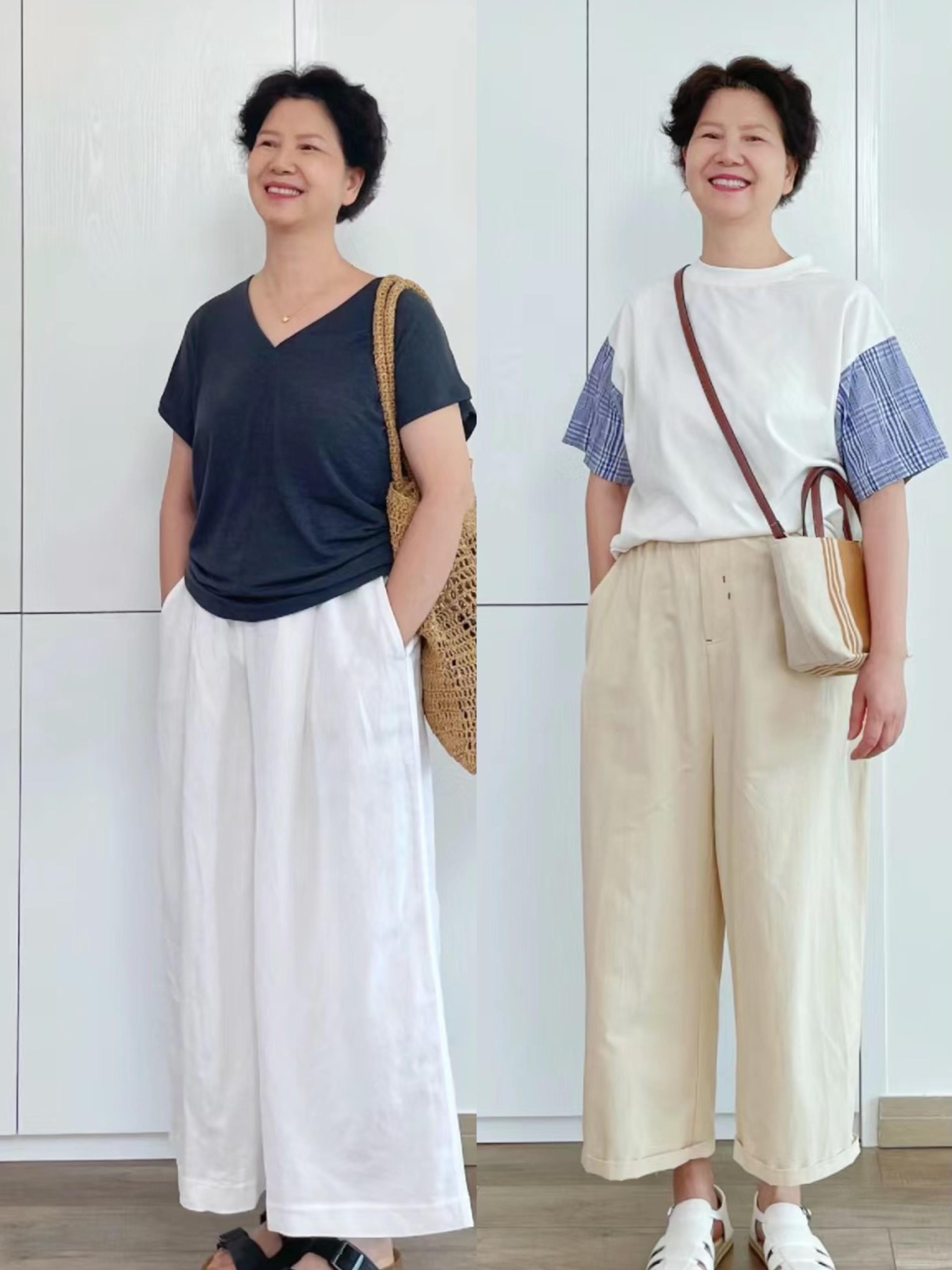 棉麻質感的闊腿褲,或者純棉成分的T恤,在這個春夏季節就是最基礎的單品。對於五六十歲的女人來講,這樣搭配隨性舒適、也慵懶大方。