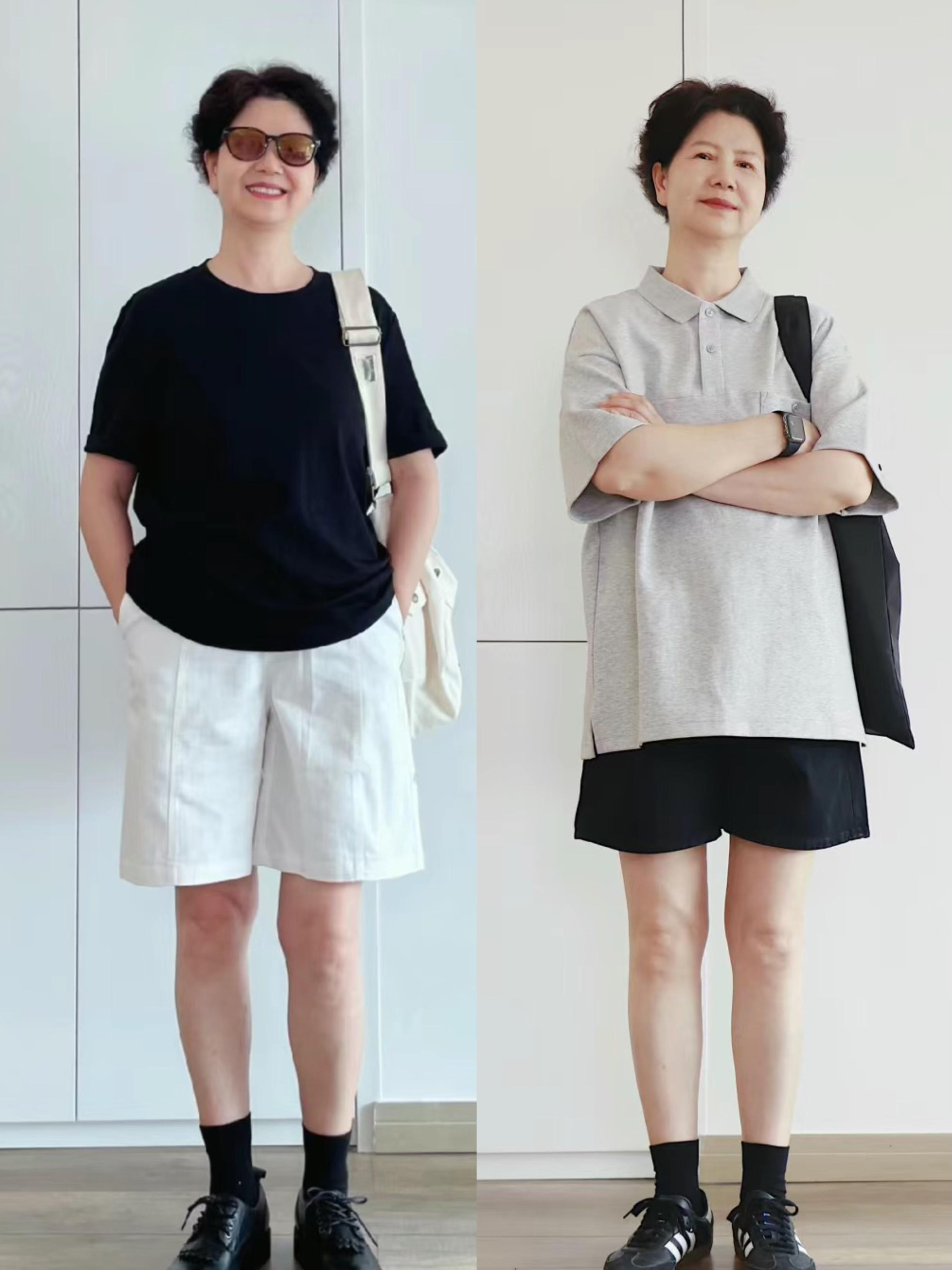 偶爾睡個懶覺,又不想費心力去搭配衣服。就選擇經典的雙色搭配,黑白配、或者黑灰配,都清爽大方。寬鬆的西裝短褲露出雙腿線條,既不費力又很惹眼。