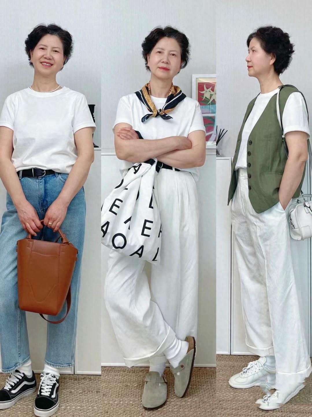 誰說白T恤+牛仔褲,只適合年輕人呢?五六十歲的女人,這樣穿真的是毫無違和感呀。雖然臉上有了皺紋,但身材依然挺拔。