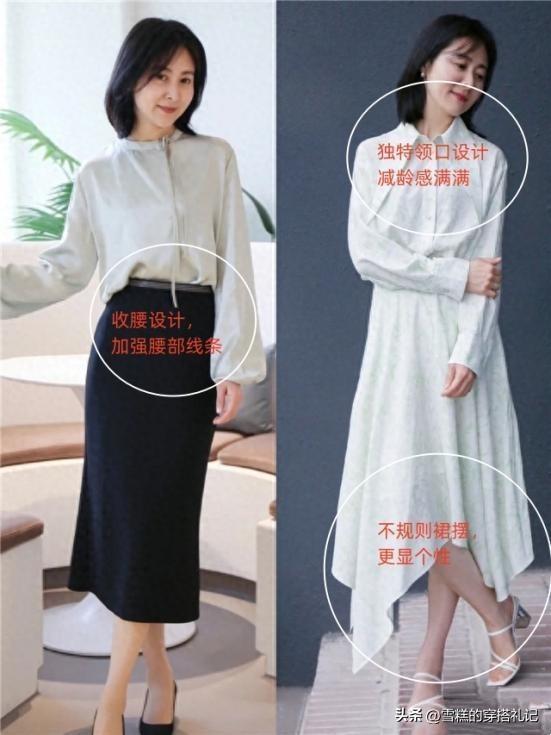 中年女性無需刻意扮嫩,大方簡約的設計可以彰顯我們的成熟與穩重,讓風格變得優雅而又知性。在細節之處多花些心思,會讓造型更有質感。例如收腰的設計,可以讓身形更加優越,着裝風格也時尚且得體。或者是不規則的裙襬設計,增添了強烈的時尚感,也讓自己更加美麗。