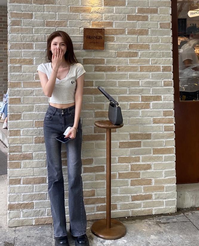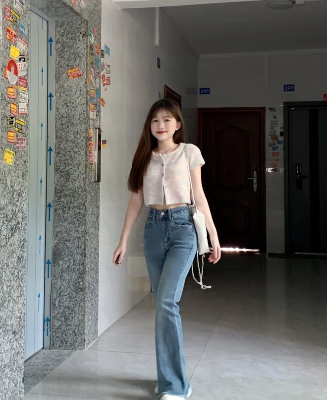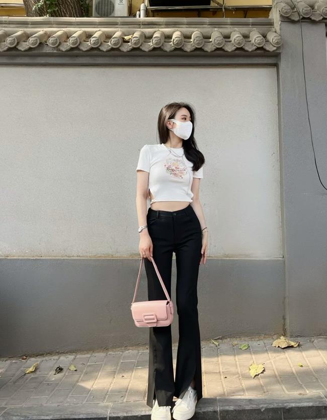 短上衣搭配微喇褲的組合,適合各個身材的女性,對於身材比較矮小的姐妹來說,短款上衣可以提高腰線比例,拉長下身的線條,讓穿着者更高挑。