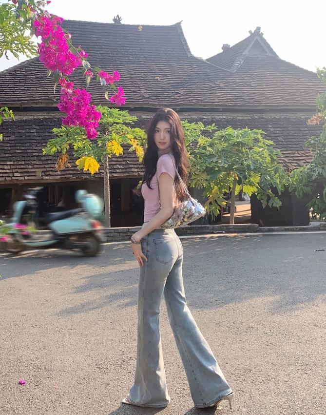首先,短款的上衣上身後可以很好優化身材比例,提高腰線,在視覺上很好拉長下身的比例,讓你的腿部線條瞧着更修長,而微喇褲褲腿微微張開,不經意間修飾了腿部線條,還非常顯瘦。