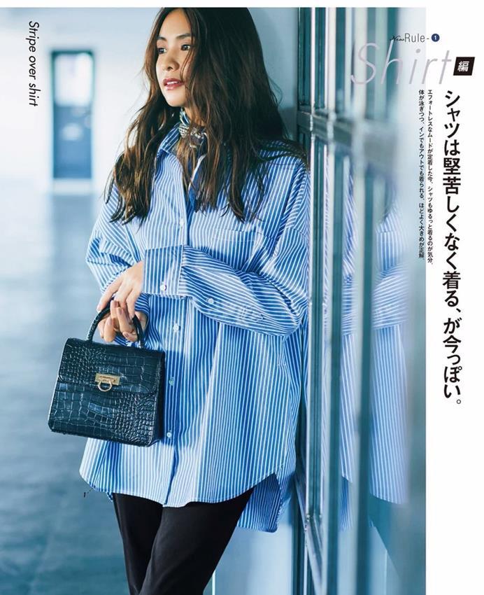 條紋款式的男朋友襯衫在搭配的時候,可以與牛仔褲、闊腿褲相配,從而營造出隨性休閒的風格,也可以選擇各種半裙相配,打造優雅知性感。通過巧妙運用一些配飾點綴,絲巾、項鍊或者是耳環等,都能爲造型增加一份亮點。