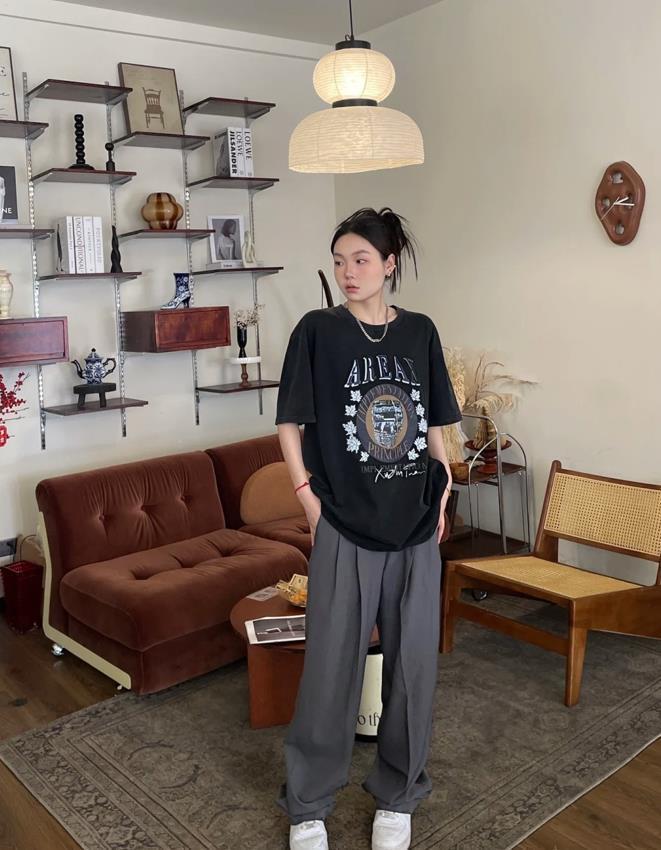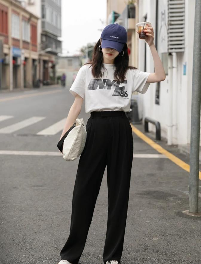 T恤作爲最基礎百搭的單品,其簡約的設計與休閒西裝褲相得益彰,不管是純色的t恤,還是帶有印花圖案的款式,都能完美與休閒西裝褲結合在一起。