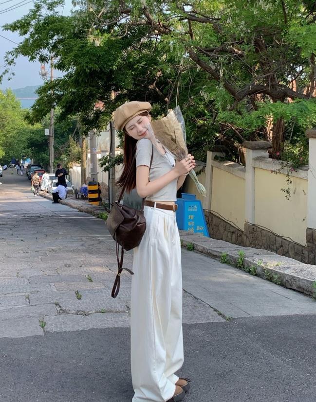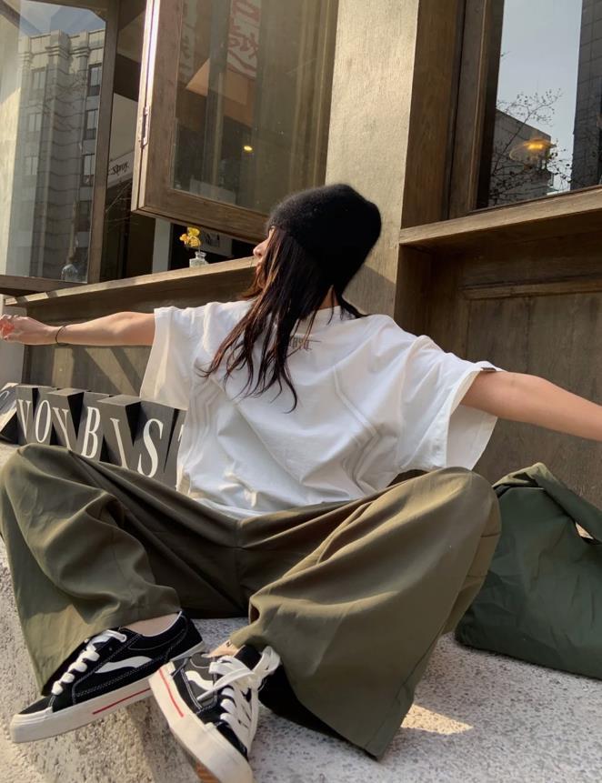 闊腿褲以寬鬆的版型爲主,讓穿着者感受到舒適自在和隨性,當它與t恤組合在一起時,整體看起來就會顯得很休閒,如果t恤也選擇了寬鬆版型,那麼一身就顯得鬆弛感十足。