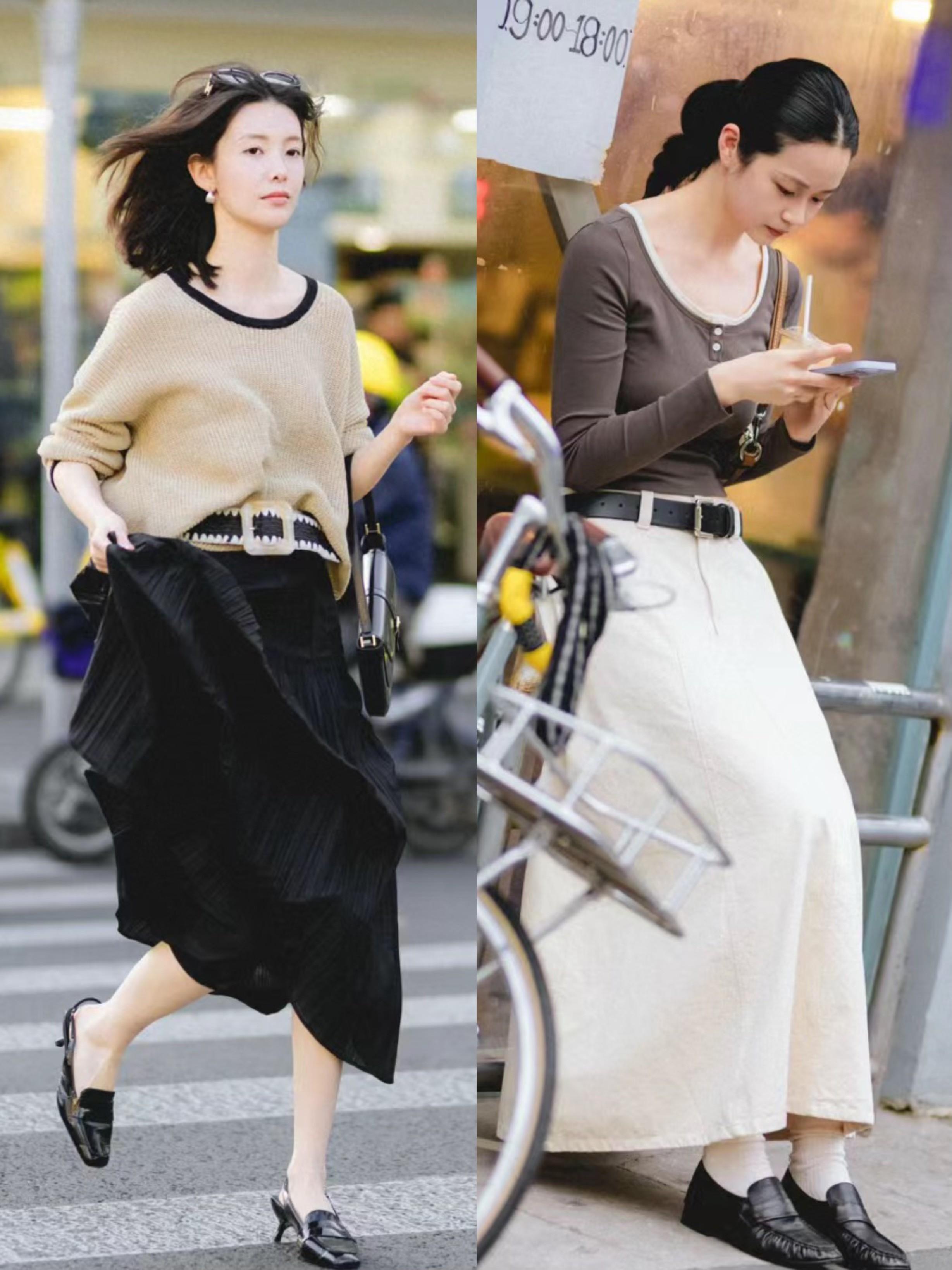 走在上海街頭,突然發現在春天火了一種穿搭。那就是“膝下裙+奶奶鞋”,膝下裙是過膝的長度,奶奶鞋是舒適的款式,二者的搭配隨性且精緻。