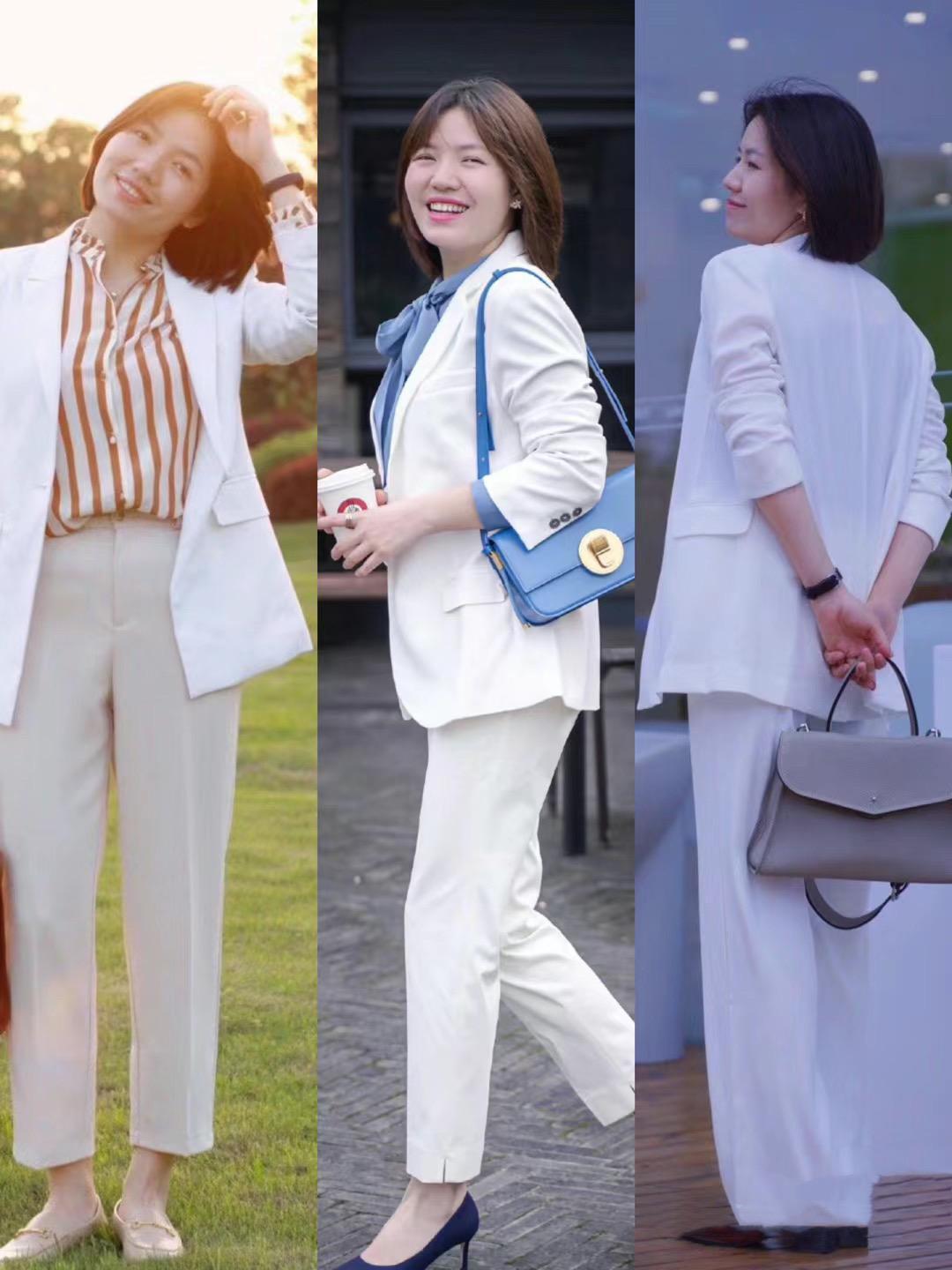 明亮色淺色系服裝,就是一種更加清新減齡的存在。比如白色西服、白色錐形褲、或者淺藍色襯衫、裸粉色針織衫等,亮度稍微高一點的淺色系,顯白又減齡。