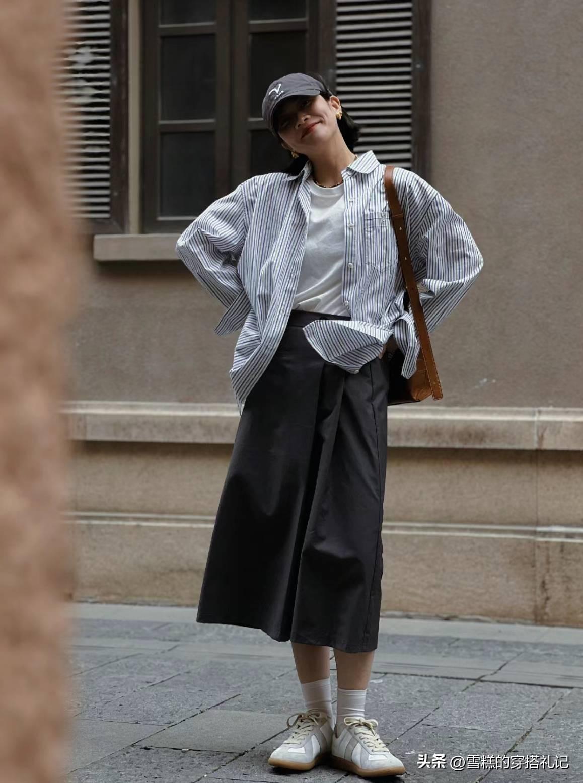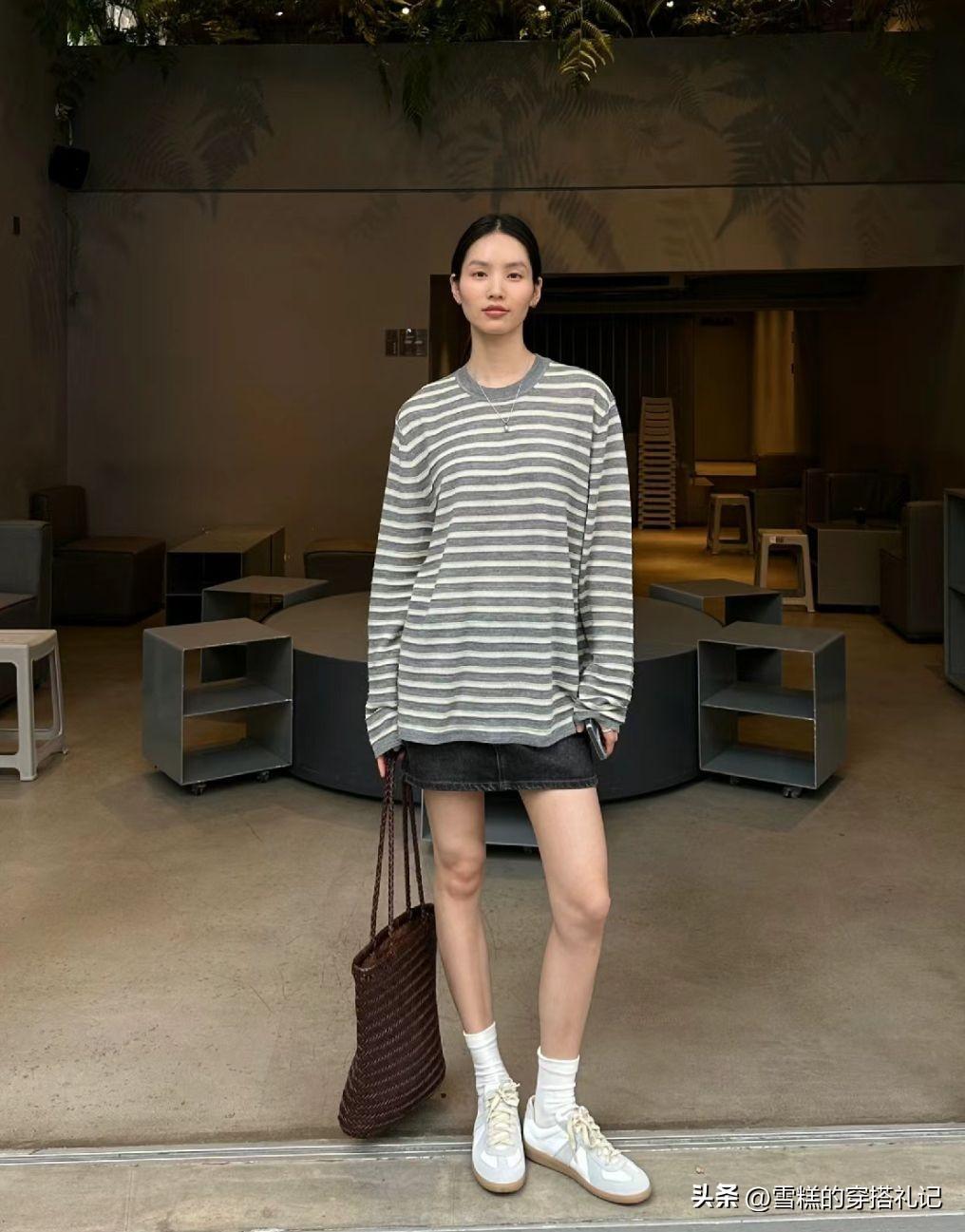 但基礎款的搭配,也要考慮到亮點的體現,比如寬鬆版型的圓領T恤配牛仔裙,就可以適當加入橫向的條紋元素,與拼接款式的德訓鞋搭配,簡約中有透露着一絲隨性灑脫。