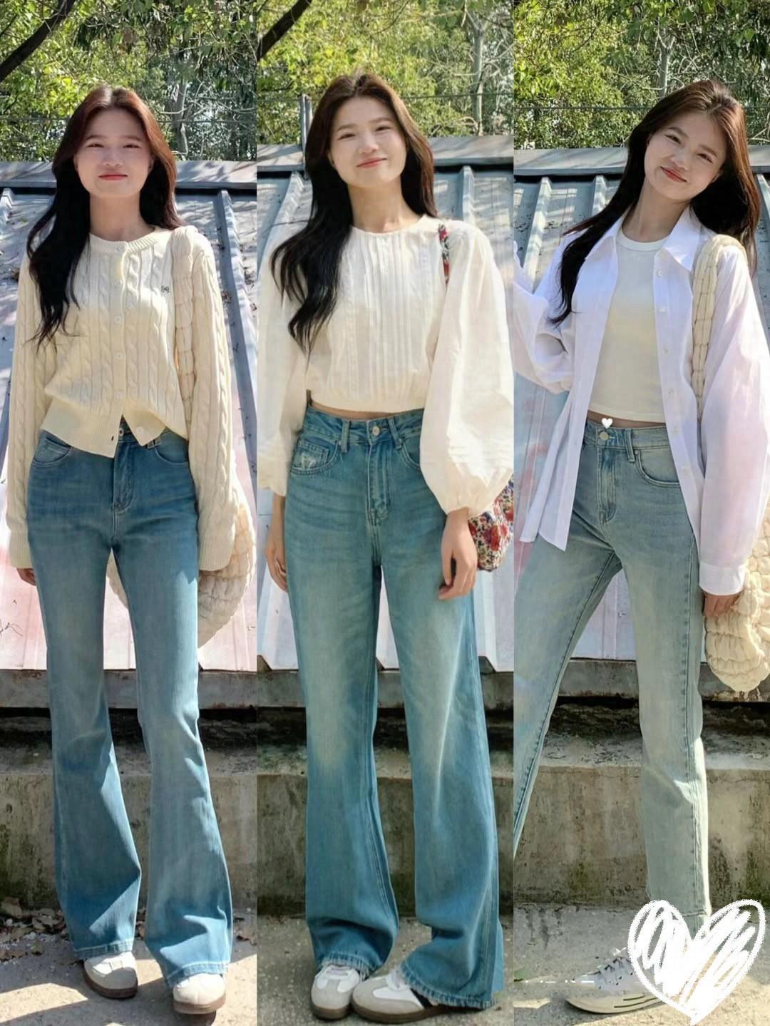 像這種短款的小香風外套,搭配高腰的直筒牛仔褲,就可以表現出一種上短下長的效果。高腰的直筒牛仔褲,抬高腰線又修飾腿型,顯得雙腿更修長。