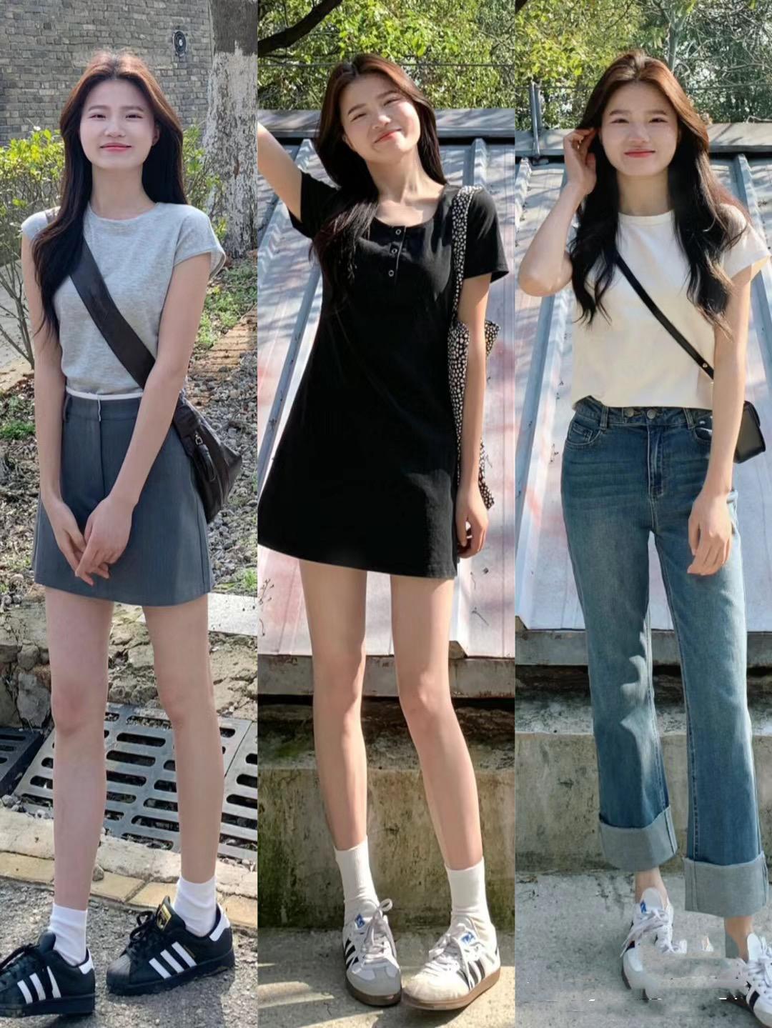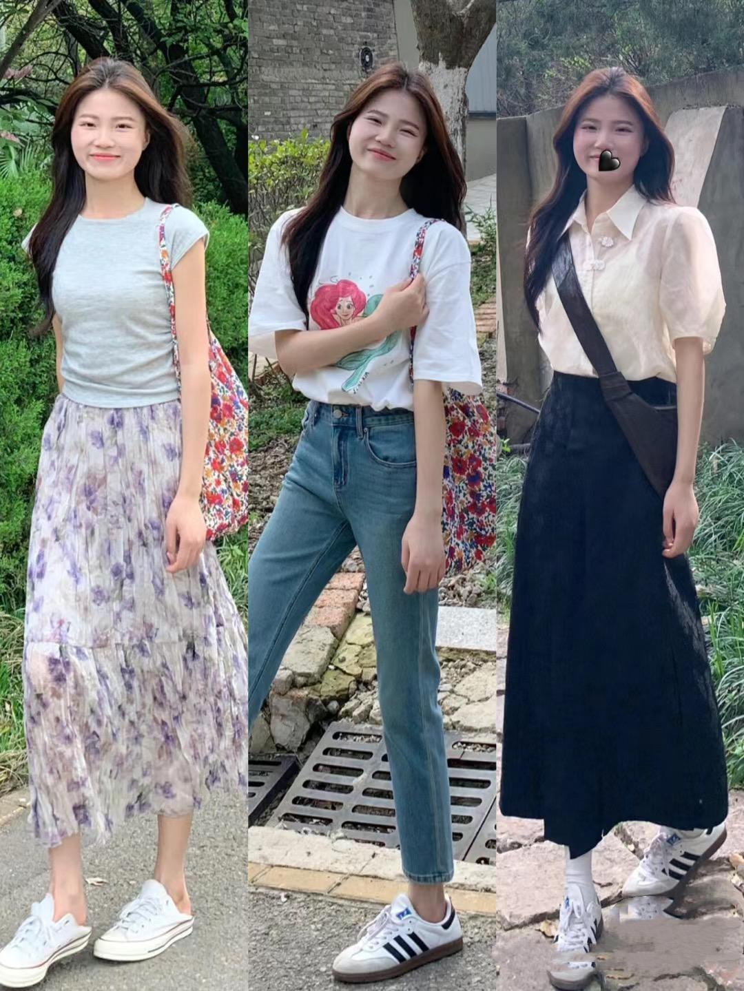 修身一點的T恤、或者字母印花T恤,在穿着中如何抬高視覺重心呢?其實我們還可以搭配高腰的半身裙、或者直筒褲。