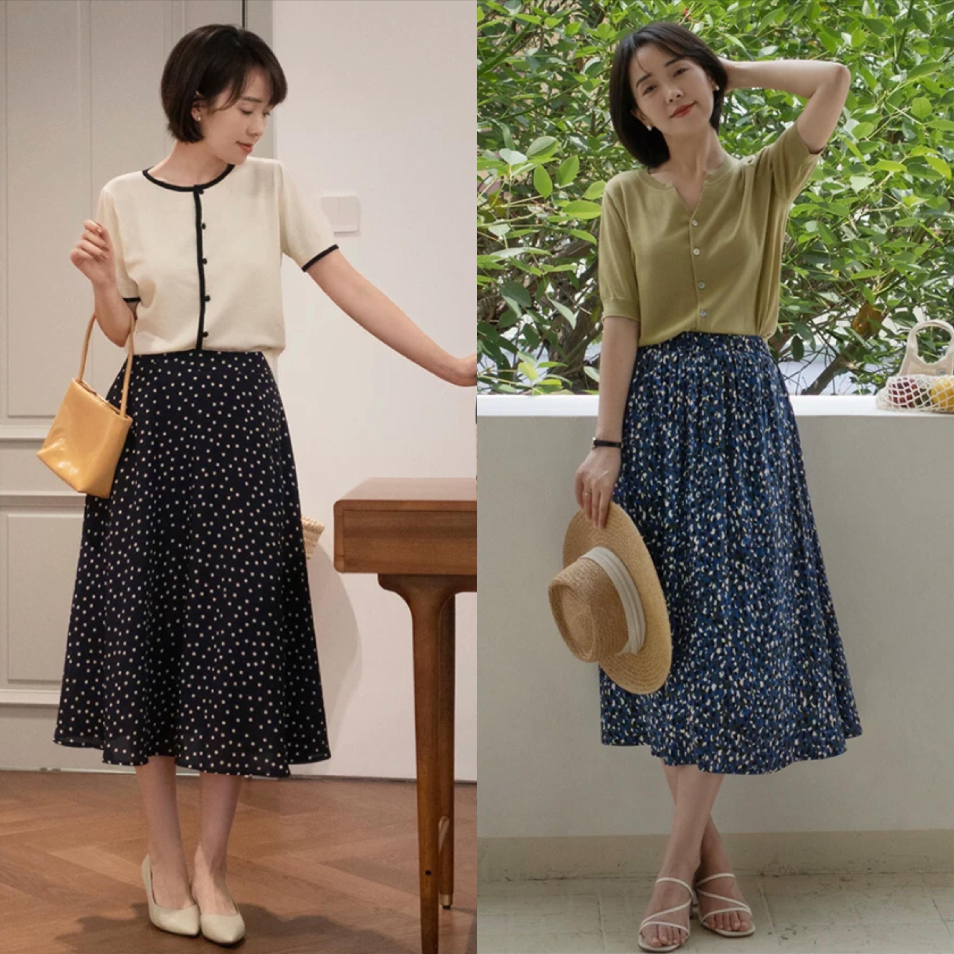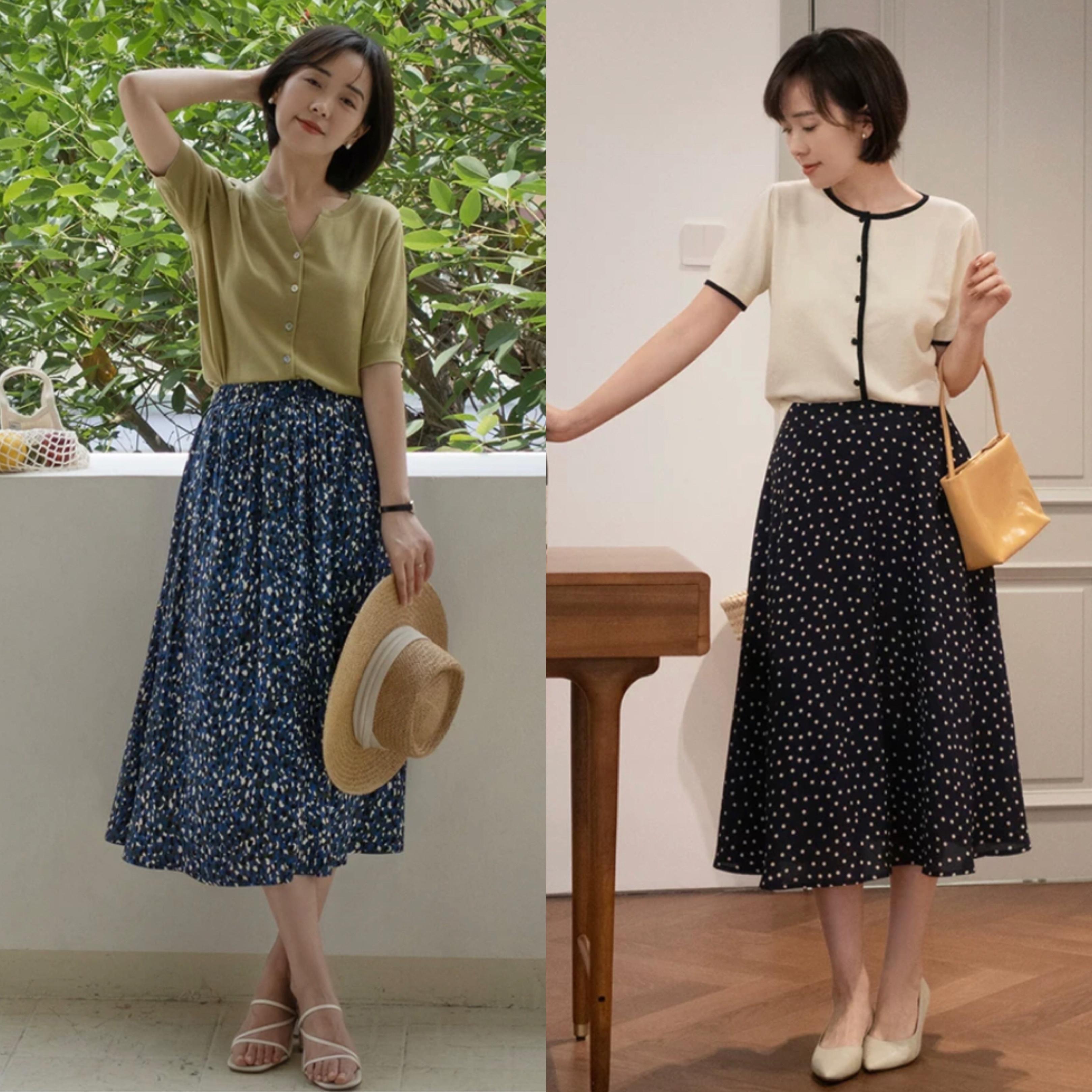 選擇碎花半身裙的時候,儘量搭配比較輕盈的面料。面料輕盈的碎花半身裙,舒適慵懶、飄逸又大方。這種深色底色的碎花半身裙,顯瘦效果也更明顯。